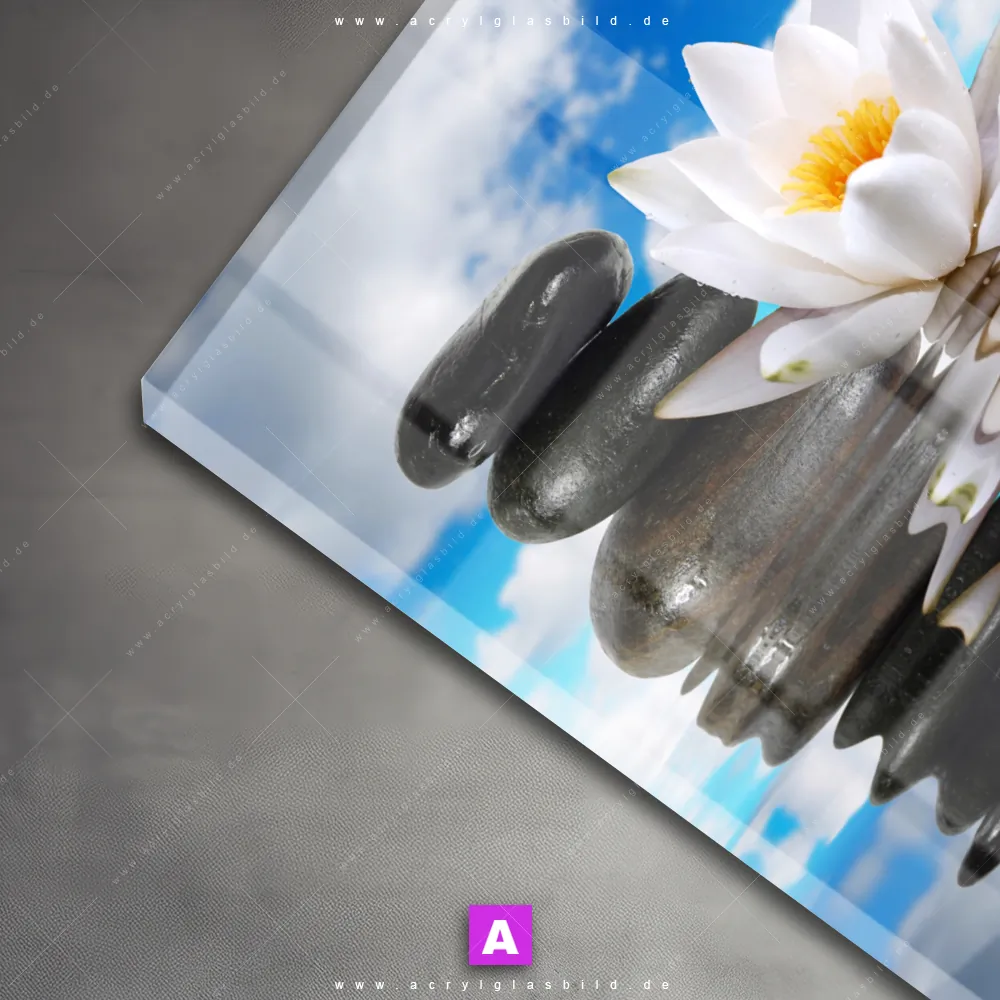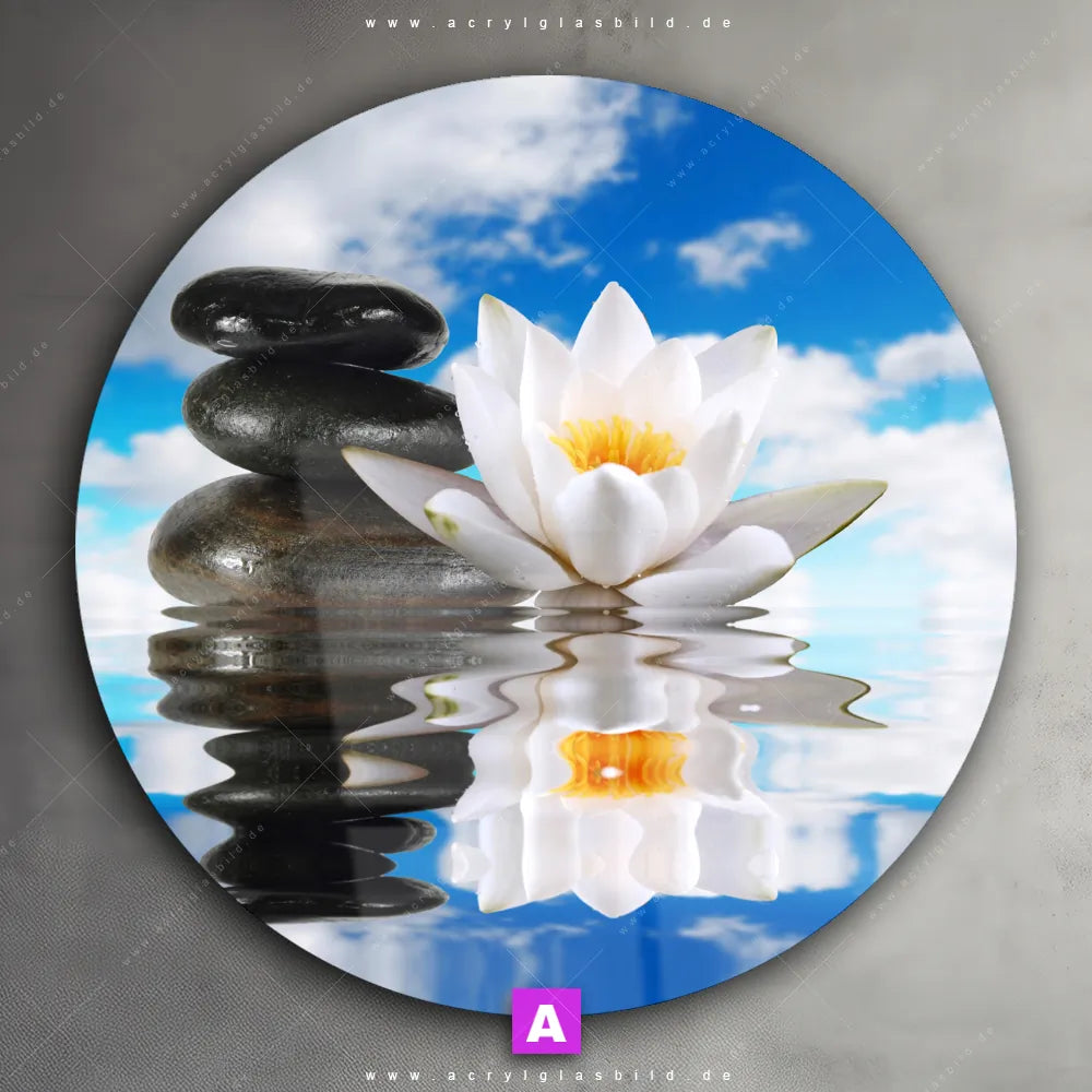 <b>Produktart:</b> Acrylglasbild | Glasbild | Wandbild aus Kunstglas | <b> Motiv:</b> Lilie & Zensteine | <b> Bildausrichtung:</b> Rund | <b> Max. Motiv-Größe:</b> 210cm breit | 180cm hoch | <b> Verfügbare Formate: </b> Quadrat, Querformat, Hochformat, Panorama, Schmal, Rund | <b> Kategorie:</b> Buddha - Feng Shui, Blumen - Botanik | <b> Farben:</b> Blau, Weiss, Schwarz | <b> Kunstformen:</b> Fotografie, Digitale Kunst | <b> Kunststile:</b> Mixed Media, Modern Art, Floral
