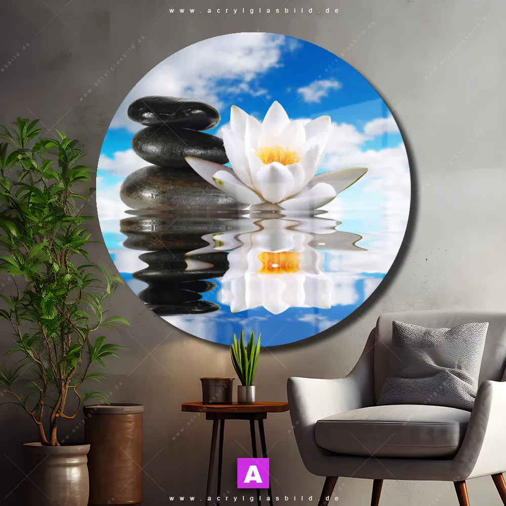 Hey du! Bist du es auch leid, auf langweilige, weiße Wände in deinem Raum zu starren und dich zu fragen, ob das der Sinn des Lebens ist? Unser Acrylglasbild mit dem Titel Lilie & Zensteine im Format Rund verwandelt deine Wand in ein Kunstwerk und macht deinen Raum zum absoluten Hingucker.