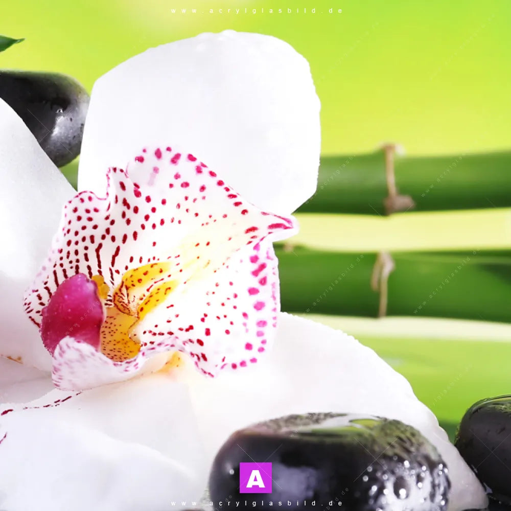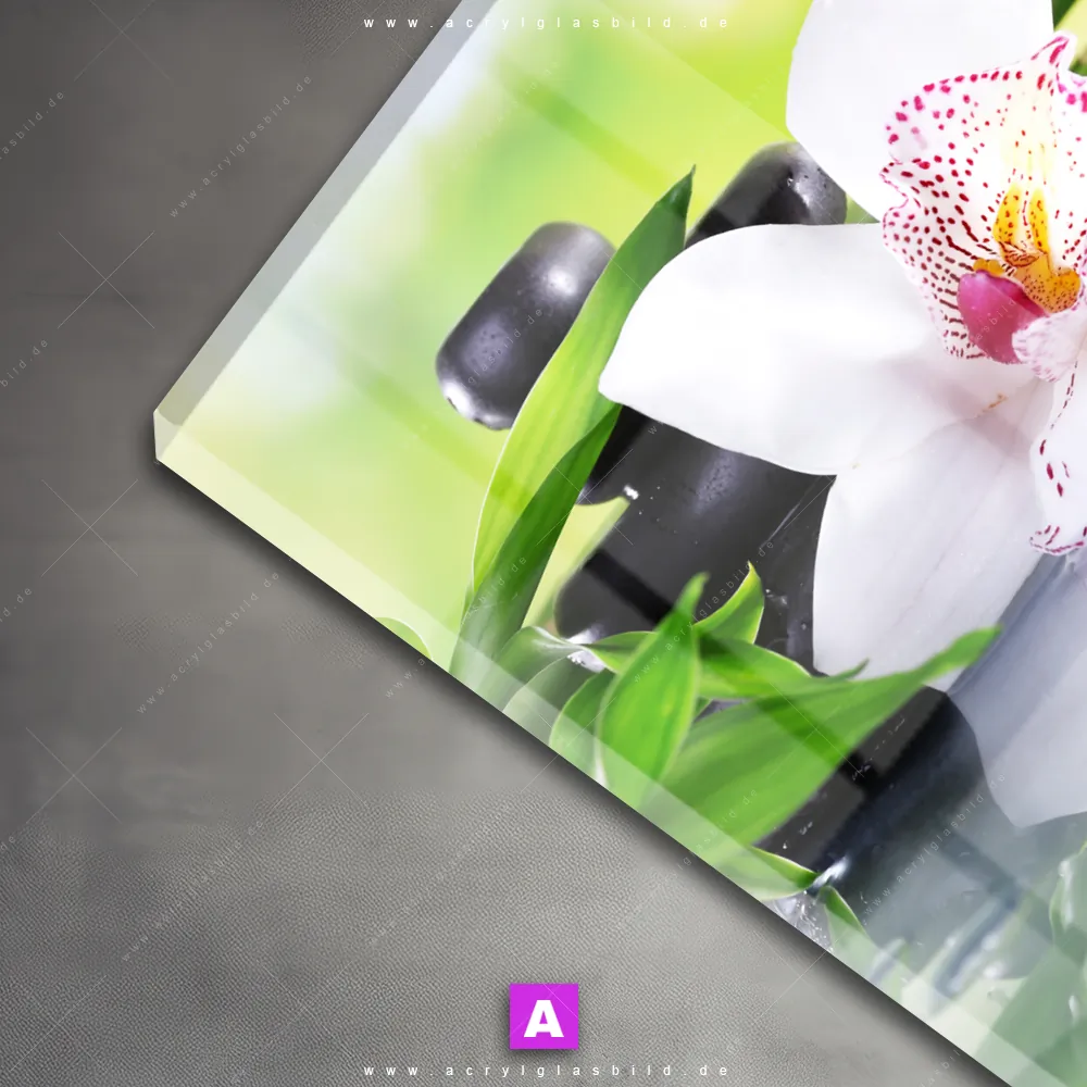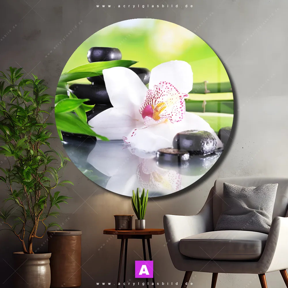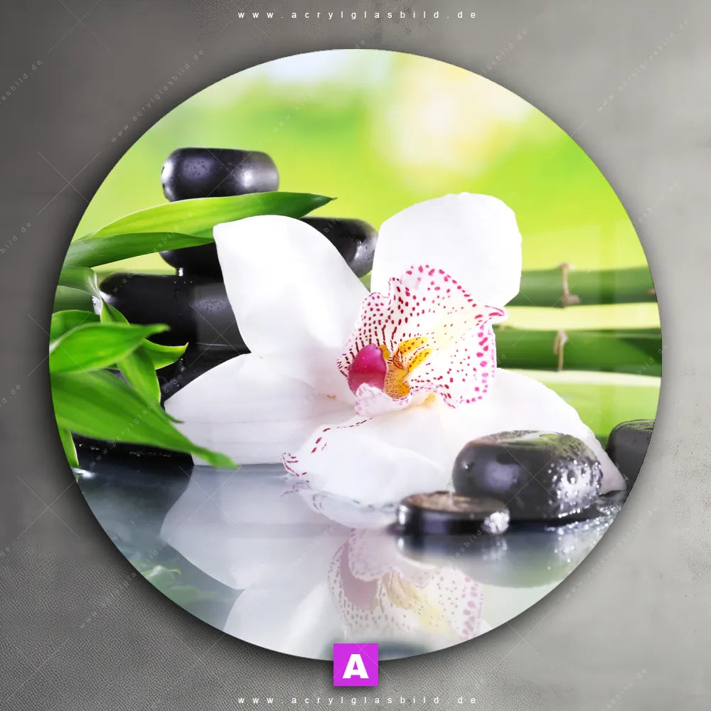 Das Motiv Spa Wellness Steine wird im UV-Direktdruck in den Farben Weiss, Grün, Schwarz, Blau auf die Rückseite einer 5mm starken, transparenten Acrylglasplatte gedruckt. Das durchscheinende Motiv Orchideenruhe im Natürlich - Realistisch, Minimalistisch Stil wird anschließend vollflächig mit einer weißen Schicht hinterlegt. Das Blumen - Botanik, Buddha - Feng Shui Acrylglasbild | Rund erhält so eine bemerkenswerte Farbbrillanz, hohe Schärfe und erstaunliche Tiefenwirkung.