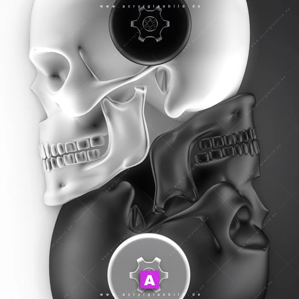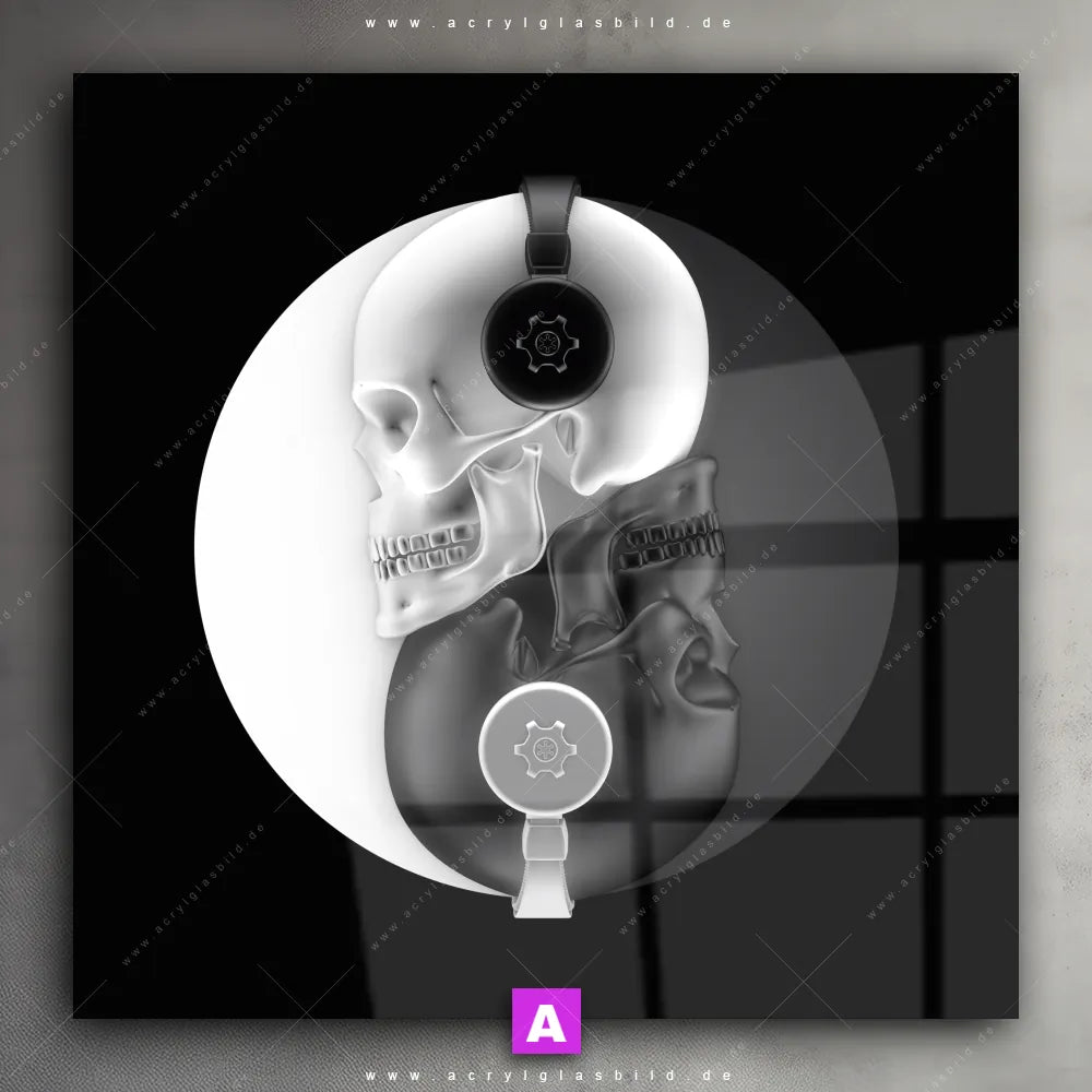 <b>Produktart:</b> Acrylglasbild | Glasbild | Wandbild aus Kunstglas | <b> Motiv:</b> Totenkopf Yin Yang | <b> Bildausrichtung:</b> Quadrat | <b> Max. Motiv-Größe:</b> 300cm breit | 300cm hoch | <b> Verfügbare Formate: </b> Quadrat, Querformat, Hochformat, Rund | <b> Kategorie:</b> Buddha - Feng Shui | <b> Farben:</b> Weiss, Schwarz, Grau | <b> Kunstformen:</b> Digitale Kunst | <b> Kunststile:</b> Mixed Media, Modern Art