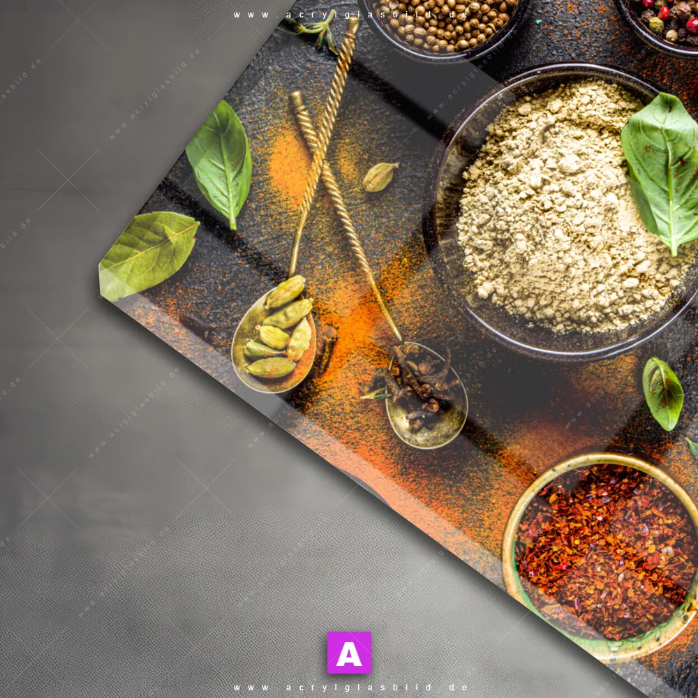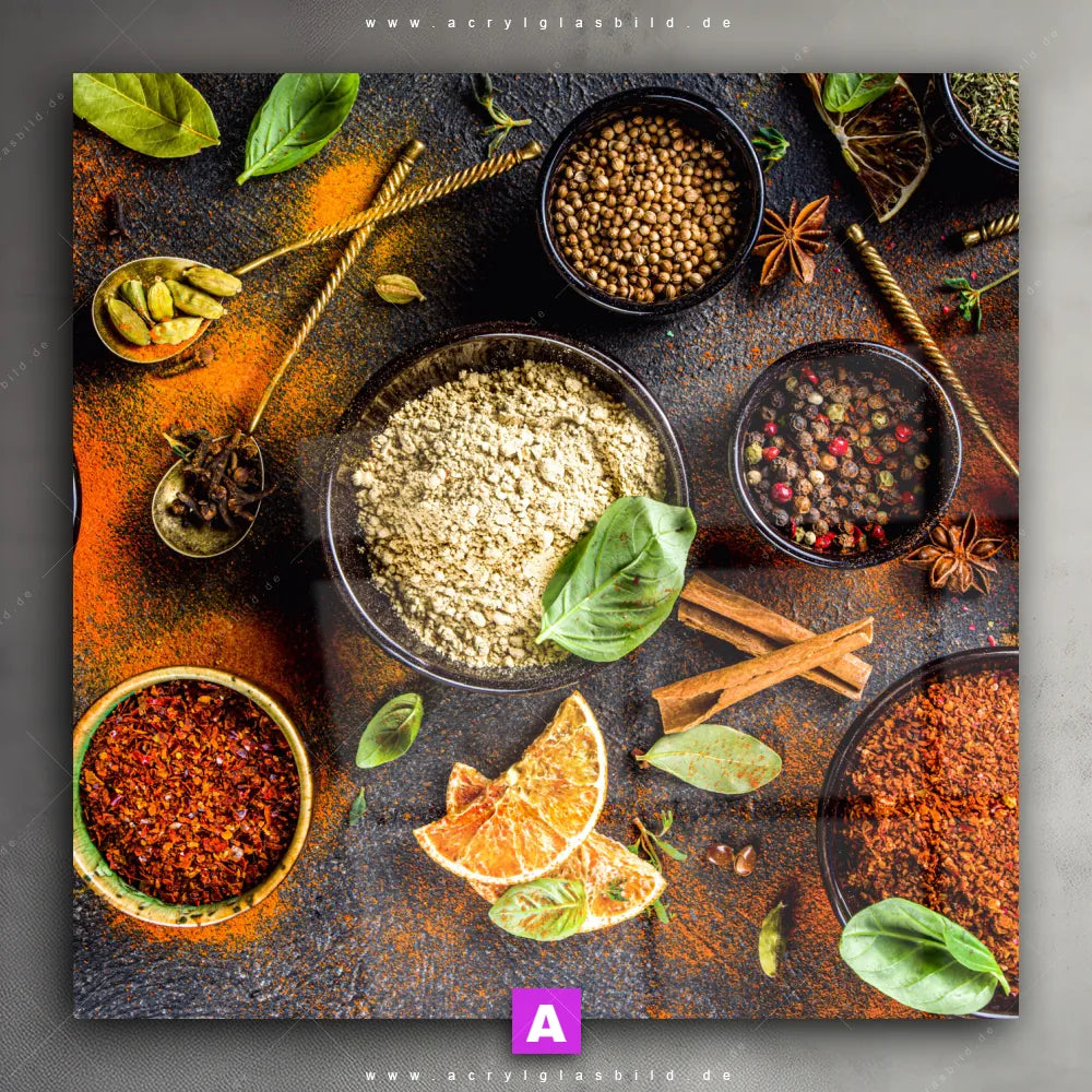 <b>Produktart:</b> Acrylglasbild | Glasbild | Wandbild aus Kunstglas | <b> Motiv:</b> Basilikum | Pfeffer | Safran & Co. | <b> Bildausrichtung:</b> Quadrat | <b> Max. Motiv-Größe:</b> 450cm breit | 300cm hoch | <b> Verfügbare Formate: </b> Quadrat, Querformat, Hochformat, Panorama, Schmal, Rund | <b> Kategorie:</b> Essen - Trinken | <b> Farben:</b> Braun, Beige, Grün, Orange, Rot, Ocker, Bunt | <b> Kunstformen:</b> Fotografie | <b> Kunststile:</b> Modern Art, Natürlich - Realistisch