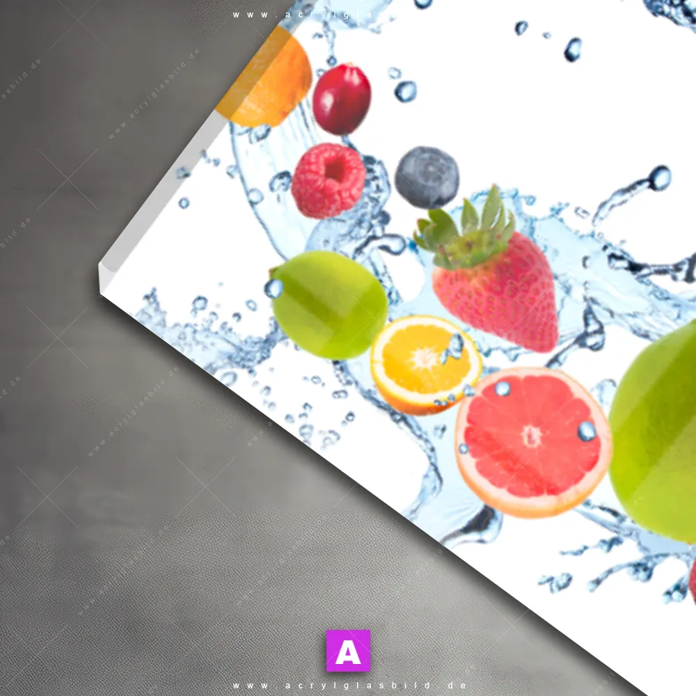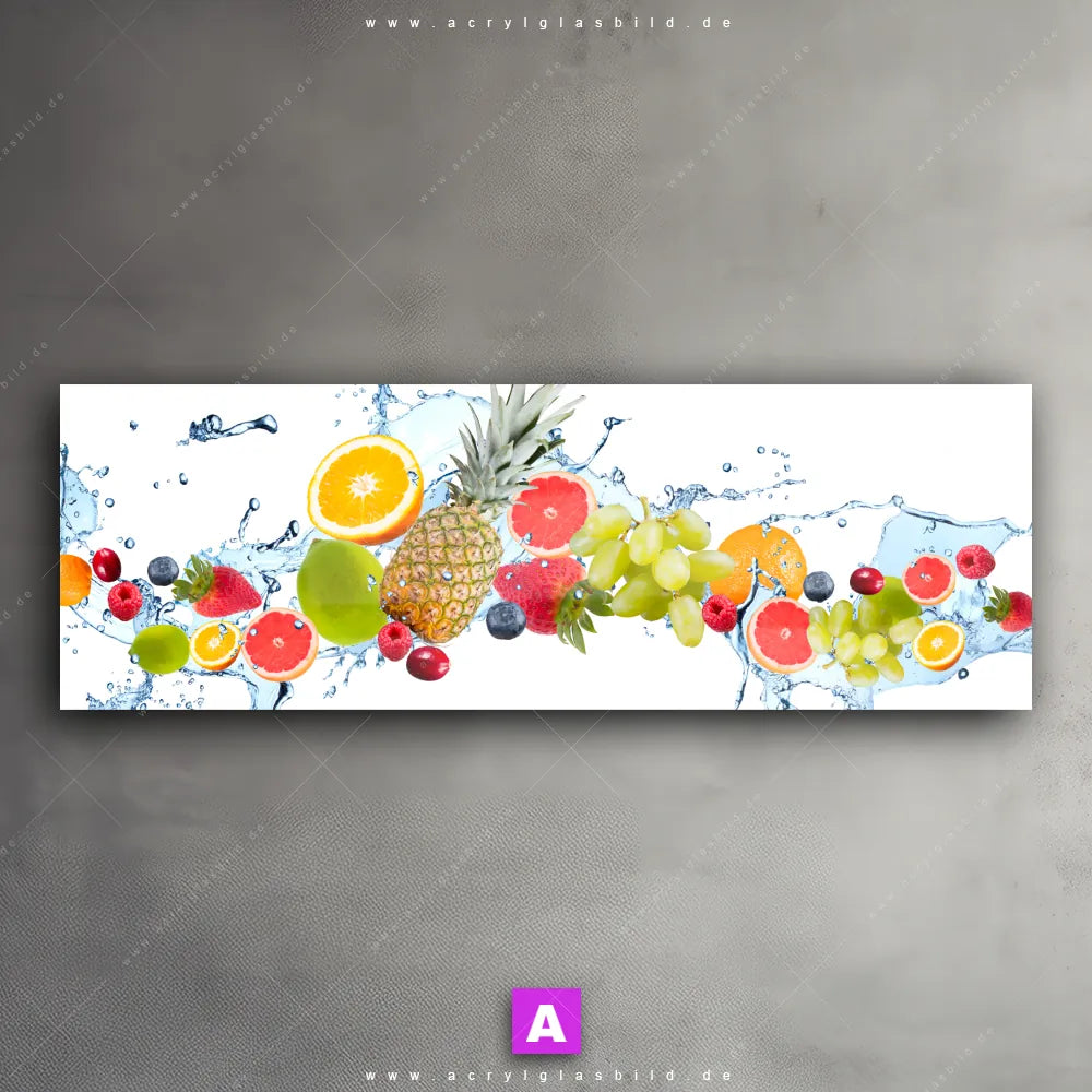 <b>Produktart:</b> Acrylglasbild | Glasbild | Wandbild aus Kunstglas | <b> Motiv:</b> Früchte in Spritzwasser | <b> Bildausrichtung:</b> Panorama | <b> Max. Motiv-Größe:</b> 421cm breit | 300cm hoch | <b> Verfügbare Formate: </b> Quadrat, Querformat, Hochformat, Panorama, Schmal, Rund | <b> Kategorie:</b> Essen - Trinken | <b> Farben:</b> Bunt, Weiss, Blau, Gelb , Braun, Grün, Lila, Orange, Rot | <b> Kunstformen:</b> Fotografie, Digitale Kunst | <b> Kunststile:</b> Mixed Media, Modern Art