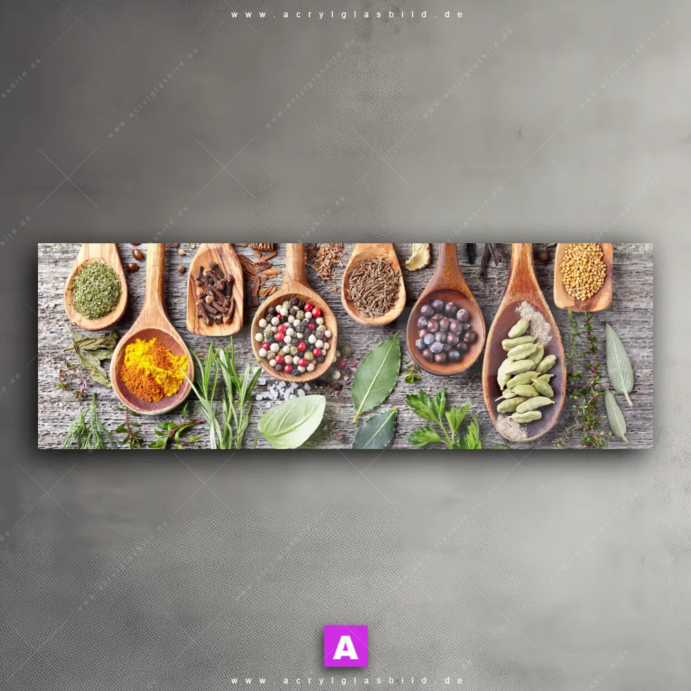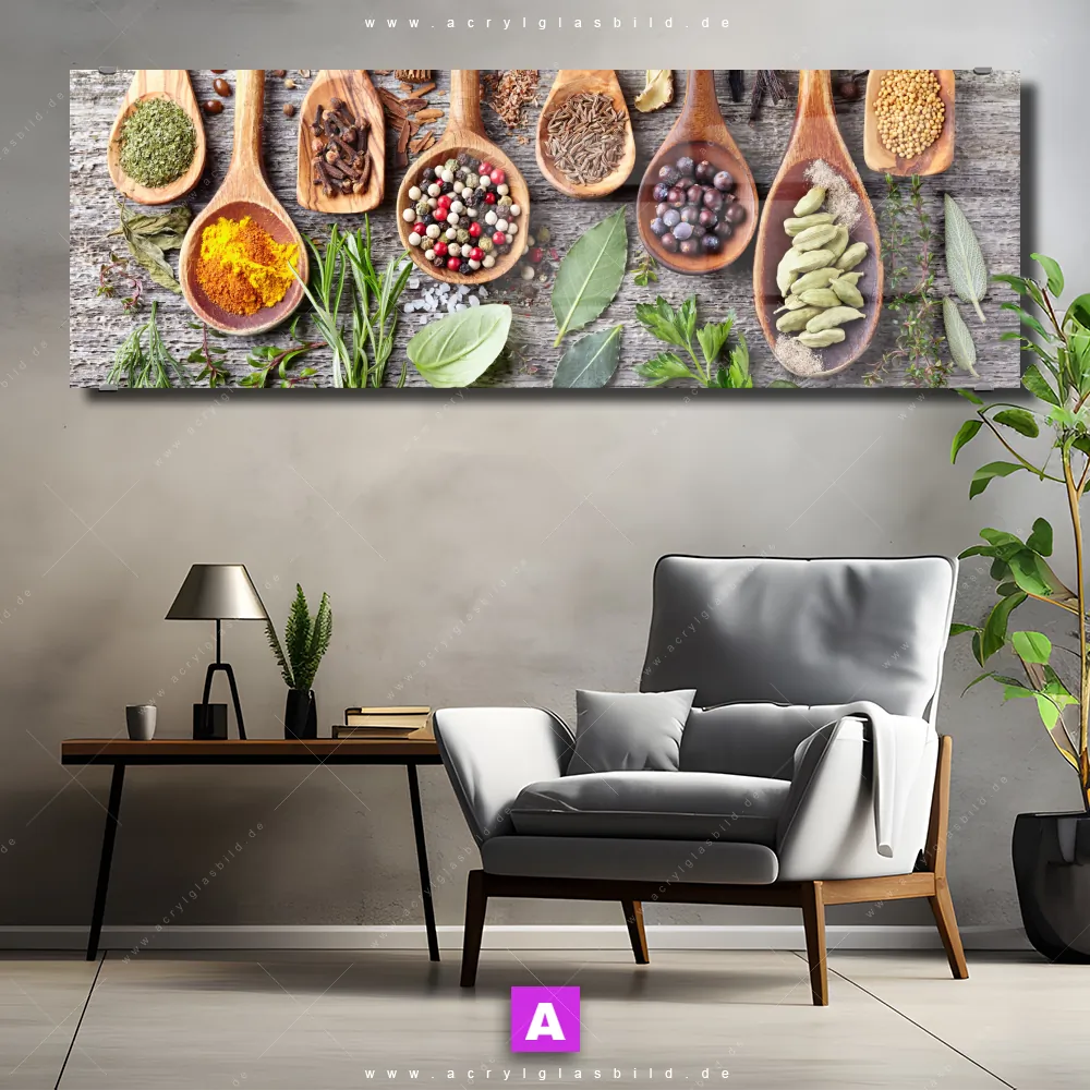 Fehlt dir die Inspiration beim Anblick deiner Wände, sodass selbst das Zählen der Wandfarbtropfen aufregender erscheint? Keine Sorge, wir haben das perfekte Kunstwerk für dich! Mit unserem Acrylglasbild Gewürze auf Holzlöffeln im Panorama-Format verleihst du deinem Raum den dringend benötigten Wow-Faktor. Lass deine Wände mit unserem Gewürze mit grünen Kräutern Acrylglasbild zum Star werden!