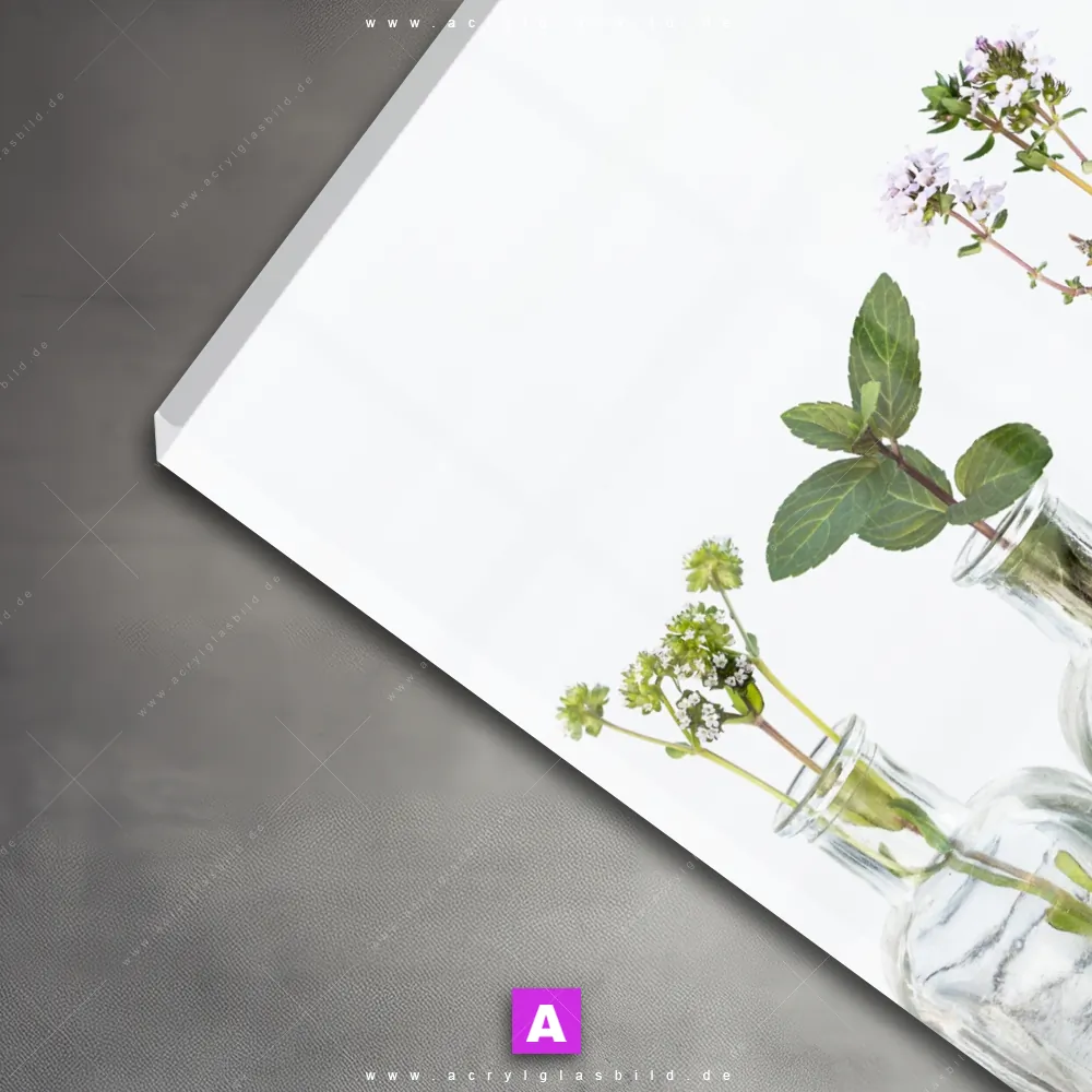 Das Motiv Kräuter in Flaschen wird im UV-Direktdruck in den Farben Weiss, Grün auf die Rückseite einer 5mm starken, transparenten Acrylglasplatte gedruckt. Das durchscheinende Motiv Lavendel & andere Kräuter im Modern Art, Natürlich - Realistisch Stil wird anschließend vollflächig mit einer weißen Schicht hinterlegt. Das Essen - Trinken Acrylglasbild | Quadrat erhält so eine bemerkenswerte Farbbrillanz, hohe Schärfe und erstaunliche Tiefenwirkung.