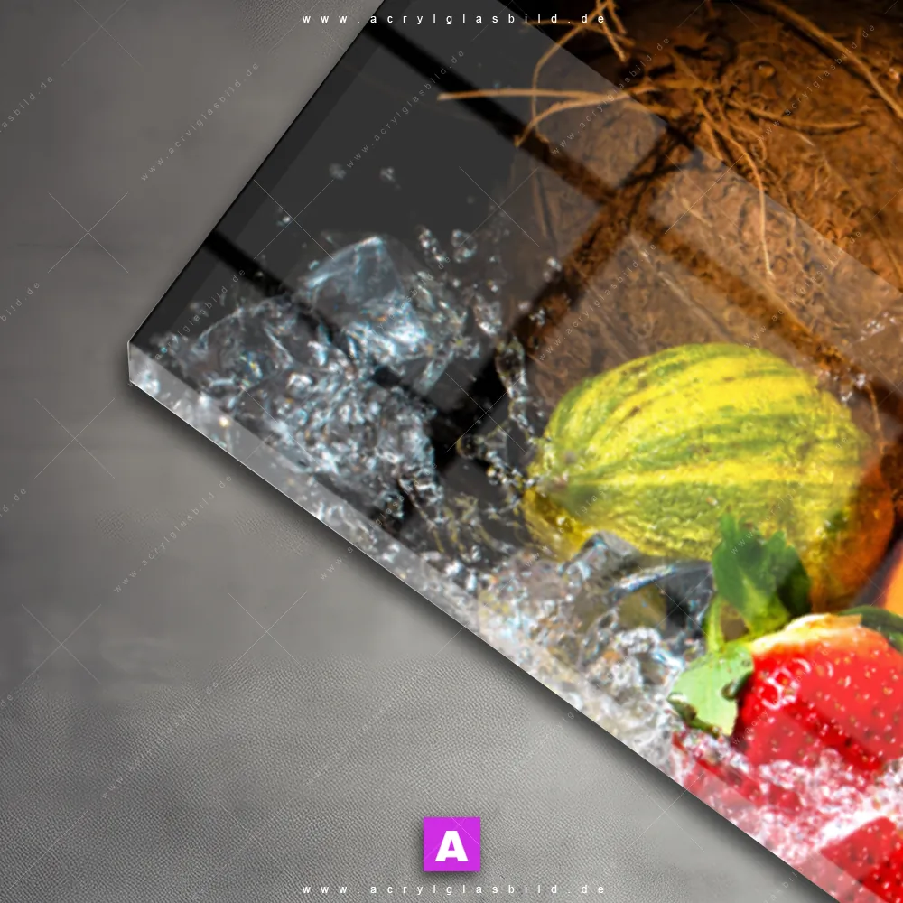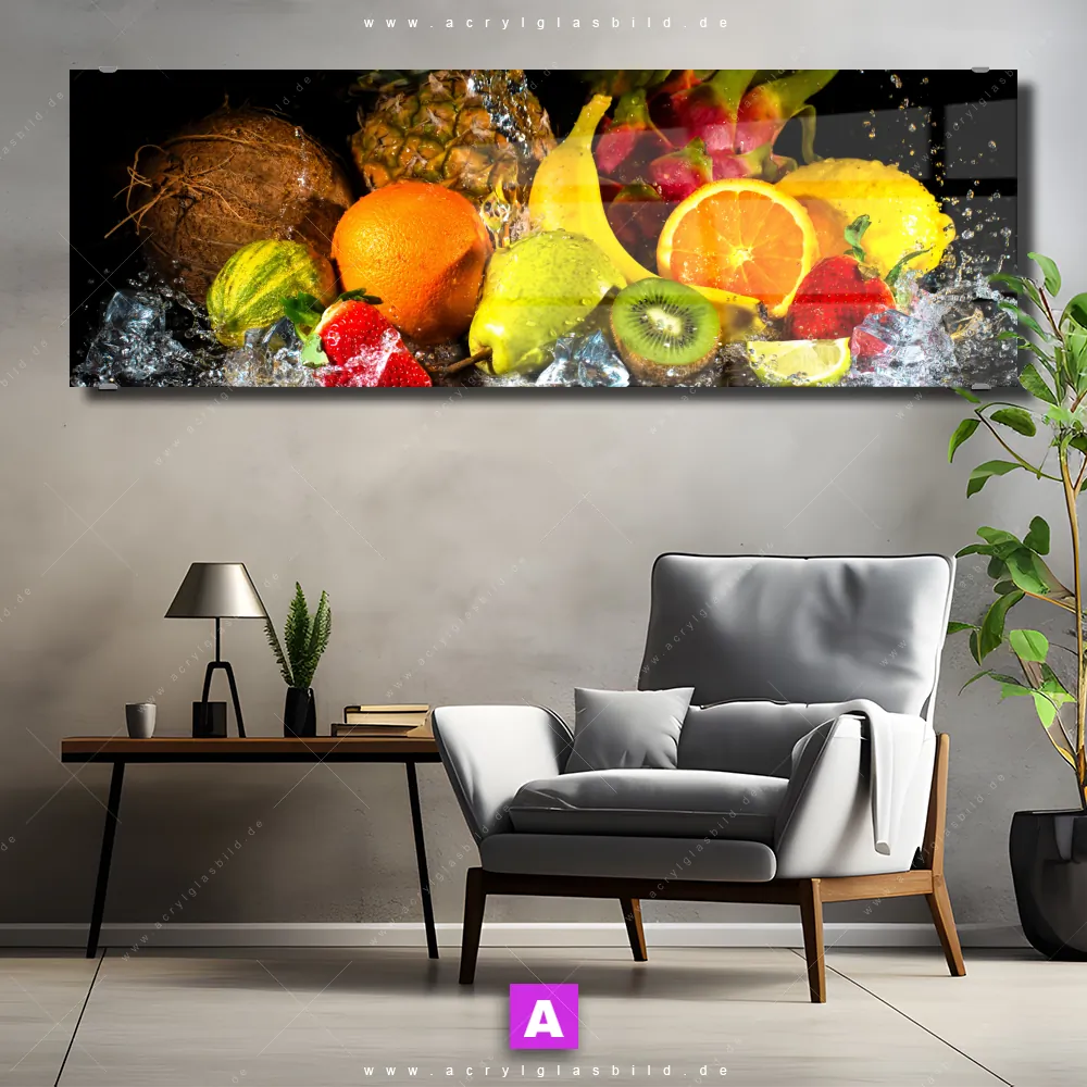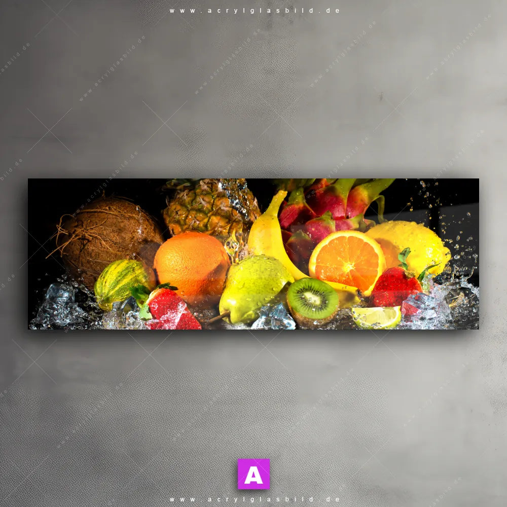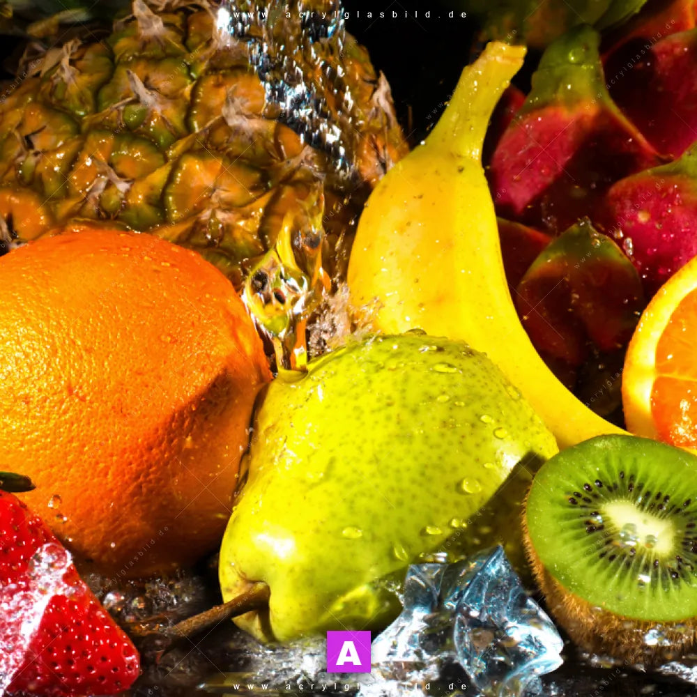 <b>Produktart:</b> Acrylglasbild | Glasbild | Wandbild aus Kunstglas | <b> Motiv:</b> Obst-in spritzendem Wasser | <b> Bildausrichtung:</b> Panorama | <b> Max. Motiv-Größe:</b> 450cm breit | 300cm hoch | <b> Verfügbare Formate: </b> Quadrat, Querformat, Hochformat, Panorama, Schmal, Rund | <b> Kategorie:</b> Essen - Trinken | <b> Farben:</b> Bunt, Schwarz, Braun, Gelb , Grün, Hellblau, Lila, Orange, Rot | <b> Kunstformen:</b> Fotografie, Digitale Kunst | <b> Kunststile:</b> Mixed Media, Modern Art