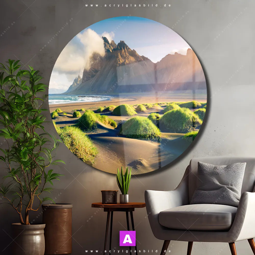 Das Motiv Beeindruckendes Island wird im UV-Direktdruck in den Farben Blau, Weiss, Grün, Hellgrün auf die Rückseite einer 5mm starken, transparenten Acrylglasplatte gedruckt. Das durchscheinende Motiv Dünen und Berge vor dem Strand im Natürlich - Realistisch Stil wird anschließend vollflächig mit einer weißen Schicht hinterlegt. Das Landschaften Acrylglasbild | Rund erhält so eine bemerkenswerte Farbbrillanz, hohe Schärfe und erstaunliche Tiefenwirkung.