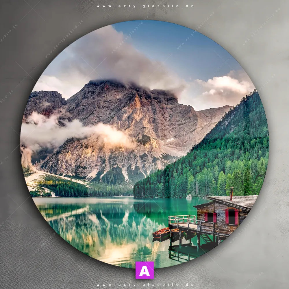 Das Motiv Bootshütte wird im UV-Direktdruck in den Farben Türkis, Orange, Blau auf die Rückseite einer 5mm starken, transparenten Acrylglasplatte gedruckt. Das durchscheinende Motiv Bergsee mit Hütte im Natürlich - Realistisch Stil wird anschließend vollflächig mit einer weißen Schicht hinterlegt. Das Landschaften Acrylglasbild | Rund erhält so eine bemerkenswerte Farbbrillanz, hohe Schärfe und erstaunliche Tiefenwirkung.