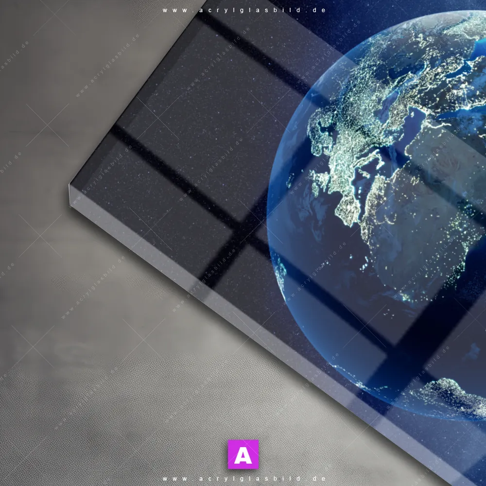 Das Motiv Die Erde wird im UV-Direktdruck in den Farben Schwarz, Blau, Türkis auf die Rückseite einer 5mm starken, transparenten Acrylglasplatte gedruckt. Das durchscheinende Motiv Weltraum Erde im Modern Art Stil wird anschließend vollflächig mit einer weißen Schicht hinterlegt. Das Landschaften Acrylglasbild | Hochformat erhält so eine bemerkenswerte Farbbrillanz, hohe Schärfe und erstaunliche Tiefenwirkung.