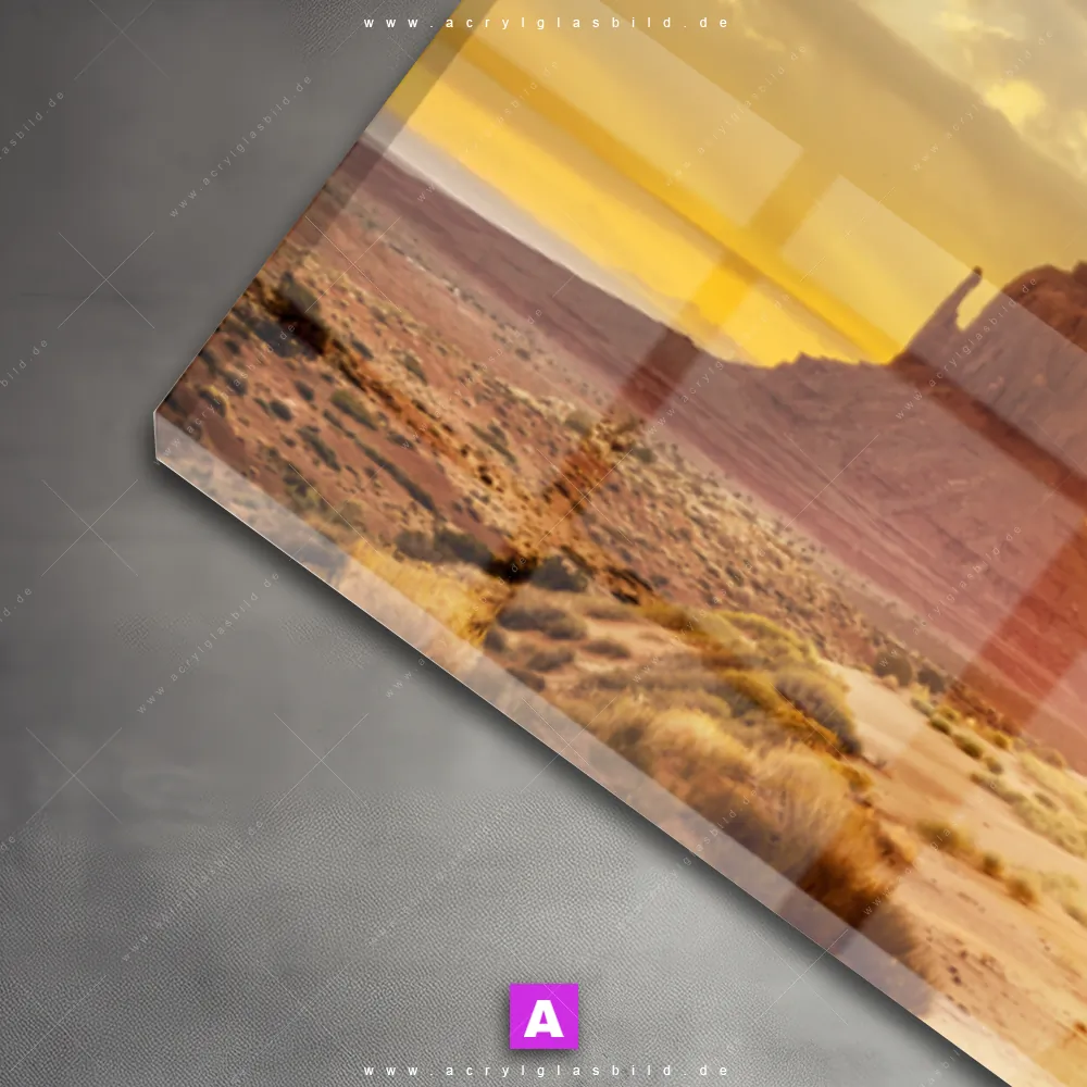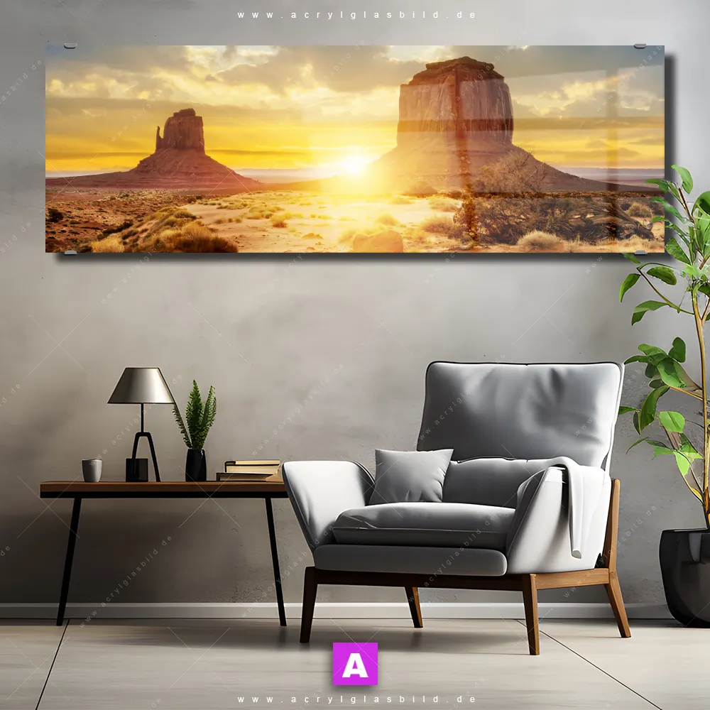 Fehlt dir die Inspiration beim Anblick deiner Wände, sodass selbst das Zählen der Wandfarbtropfen aufregender erscheint? Keine Sorge, wir haben das perfekte Kunstwerk für dich! Mit unserem Acrylglasbild Felsen in Wüste im Panorama-Format verleihst du deinem Raum den dringend benötigten Wow-Faktor. Lass deine Wände mit unserem Monument Valley Felsen in der Abendsonne Acrylglasbild zum Star werden!