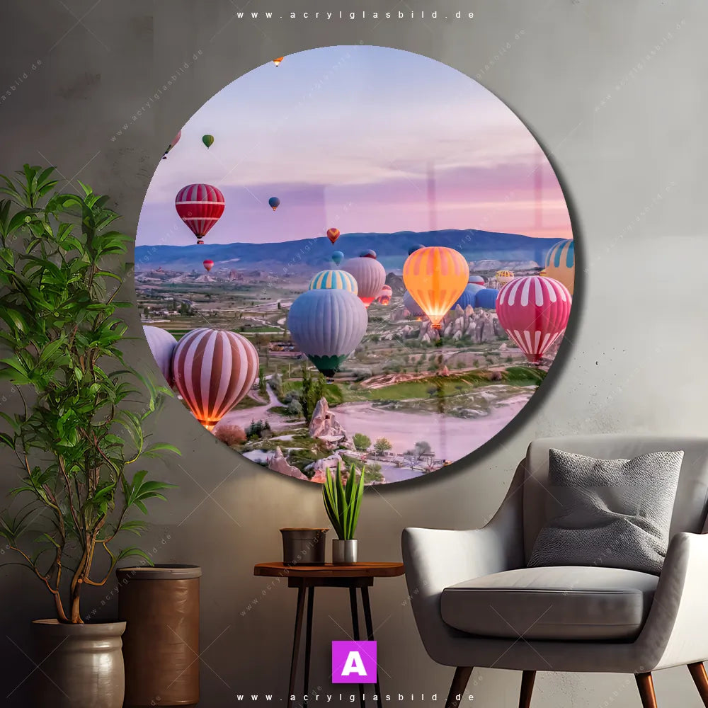 <b>Produktart:</b> Acrylglasbild | Glasbild | Wandbild aus Kunstglas | <b> Motiv:</b> Heißluftballons im Sonnenuntergang | <b> Bildausrichtung:</b> Rund | <b> Max. Motiv-Größe:</b> 240cm breit | 150cm hoch | <b> Verfügbare Formate: </b> Quadrat, Querformat, Hochformat, Panorama, Schmal, Rund | <b> Kategorie:</b> Landschaften | <b> Farben:</b> Pink, Lila, Orange, Rot, Rosa, Grün, Blau, Bunt | <b> Kunstformen:</b> Fotografie | <b> Kunststile:</b> Natürlich - Realistisch