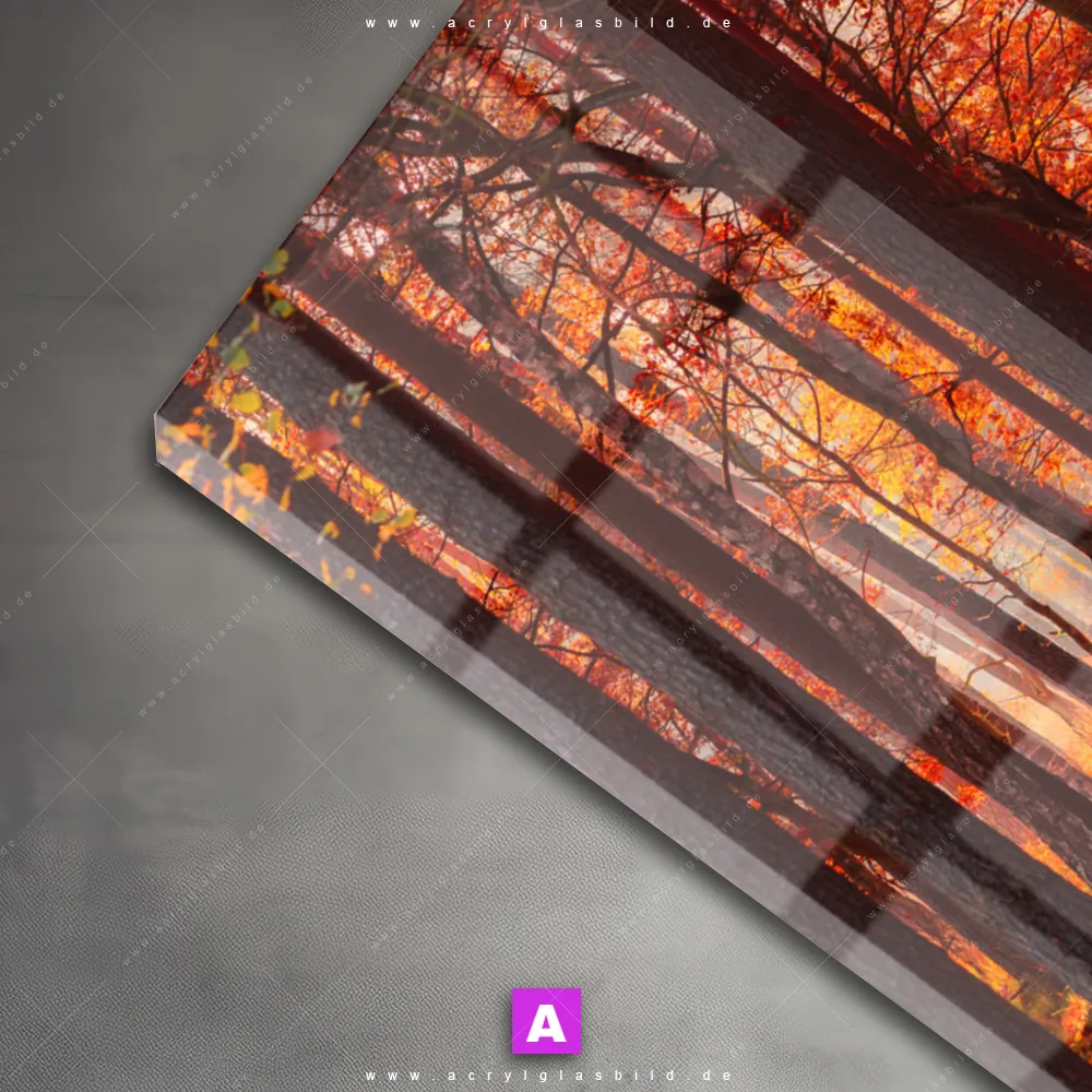 Das Motiv Herbstwald wird im UV-Direktdruck in den Farben Braun, Orange, Rot auf die Rückseite einer 5mm starken, transparenten Acrylglasplatte gedruckt. Das durchscheinende Motiv Wald in herbstlichen Farbtönen im Natürlich - Realistisch Stil wird anschließend vollflächig mit einer weißen Schicht hinterlegt. Das Landschaften, Wald - Bäume Acrylglasbild | Hochformat erhält so eine bemerkenswerte Farbbrillanz, hohe Schärfe und erstaunliche Tiefenwirkung.