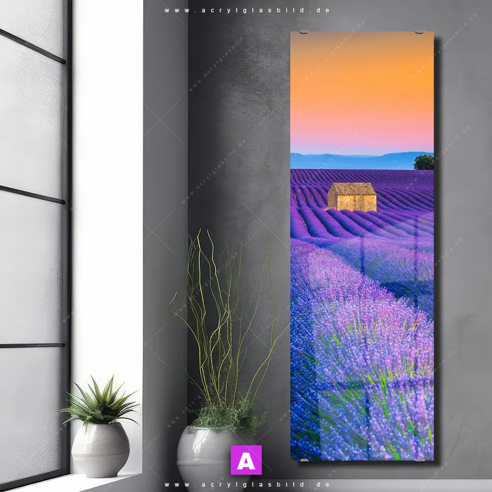 <b>Produktart:</b> Acrylglasbild | Glasbild | Wandbild aus Kunstglas | <b> Motiv:</b> Lavendel Blumen Feld | <b> Bildausrichtung:</b> Schmal | <b> Max. Motiv-Größe:</b> 450cm breit | 300cm hoch | <b> Verfügbare Formate: </b> Quadrat, Querformat, Hochformat, Panorama, Schmal, Rund | <b> Kategorie:</b> Landschaften | <b> Farben:</b> Lila, Orange | <b> Kunstformen:</b> Fotografie | <b> Kunststile:</b> Floral, Natürlich - Realistisch