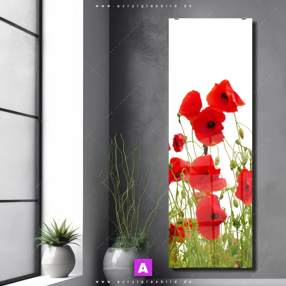 Die einzigartigen Farben in Rot, Grün, Weiss machen das Acrylglasbild Mohnblumen mit Blume, Botanik, Pflanze, Natur, Mohn, Mohnblume, Wiese zu einem echten Hingucker. Egal ob deine Einrichtung minimalistisch, modern oder doch eher wild und ausgefallen ist - unser Acrylglasbild rote Blumen vor weißem Hintergrund im Natürlich - Realistisch Stil passt immer, auch in Wohnzimmer - Schlafzimmer, Küche - Esszimmer, Friseur - Beauty, Flur - Eingangsbereich, Büro - Kanzlei, Arzt - Praxis.