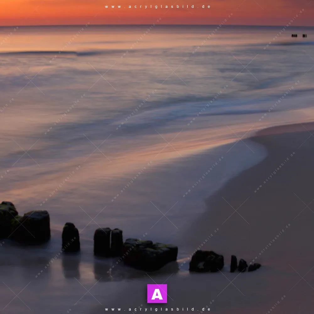 Also, worauf wartest du noch? Verwandle deine tristen Wände in Arzt - Praxis, Büro - Kanzlei, Wohnzimmer - Schlafzimmer in inspirierende Kunstwerke aus der Kategorie Strand - Meer, Landschaften und bestelle jetzt das Acrylglasbild Buhne im Wasser in Sonnenuntergangsfarben!