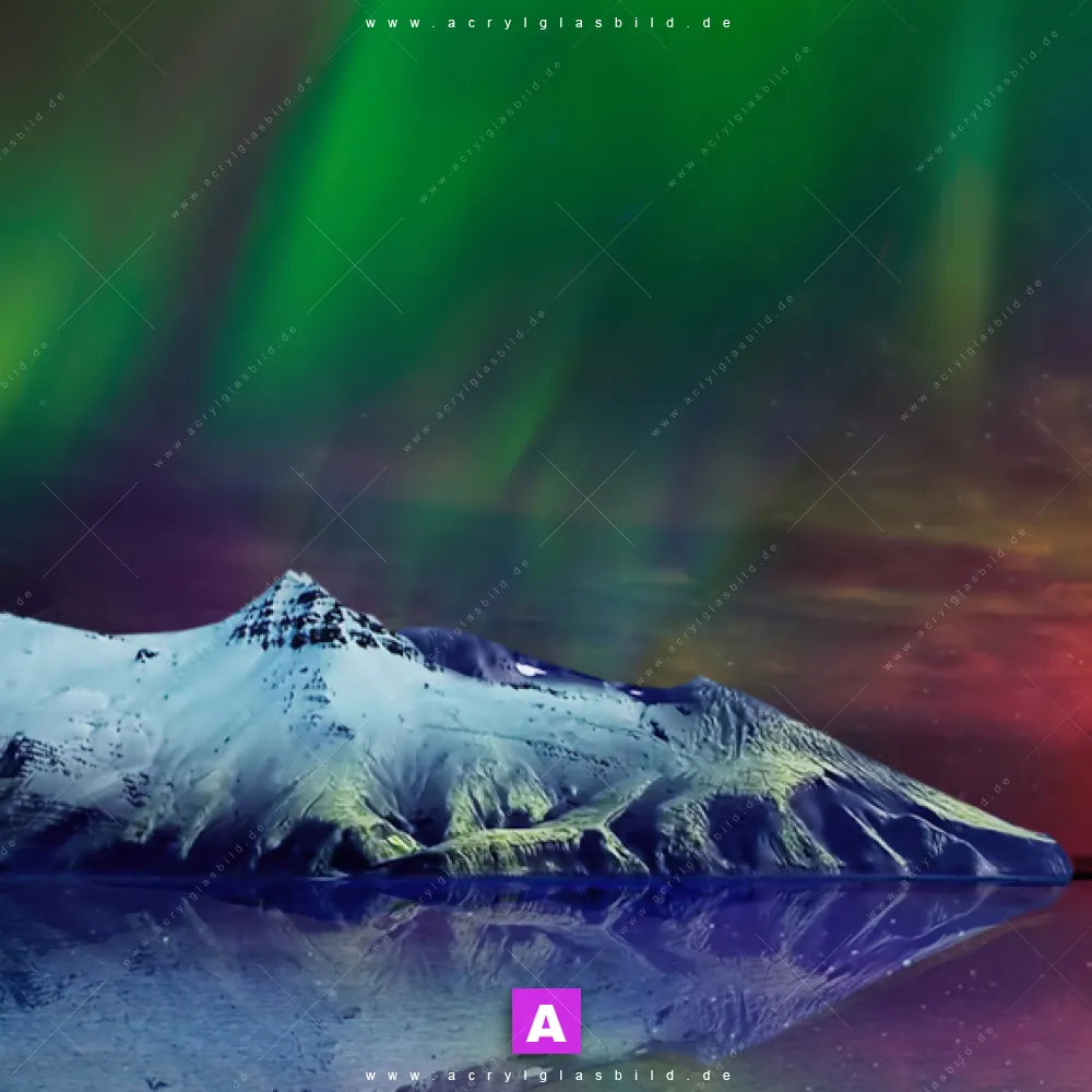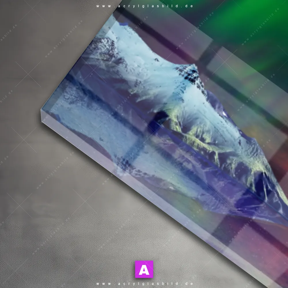 Das Motiv Polarlichter wird im UV-Direktdruck in den Farben Rot, Grün, Blau auf die Rückseite einer 5mm starken, transparenten Acrylglasplatte gedruckt. Das durchscheinende Motiv Nordlichter über den Bergspitzen im Natürlich - Realistisch Stil wird anschließend vollflächig mit einer weißen Schicht hinterlegt. Das Landschaften Acrylglasbild | Panorama erhält so eine bemerkenswerte Farbbrillanz, hohe Schärfe und erstaunliche Tiefenwirkung.