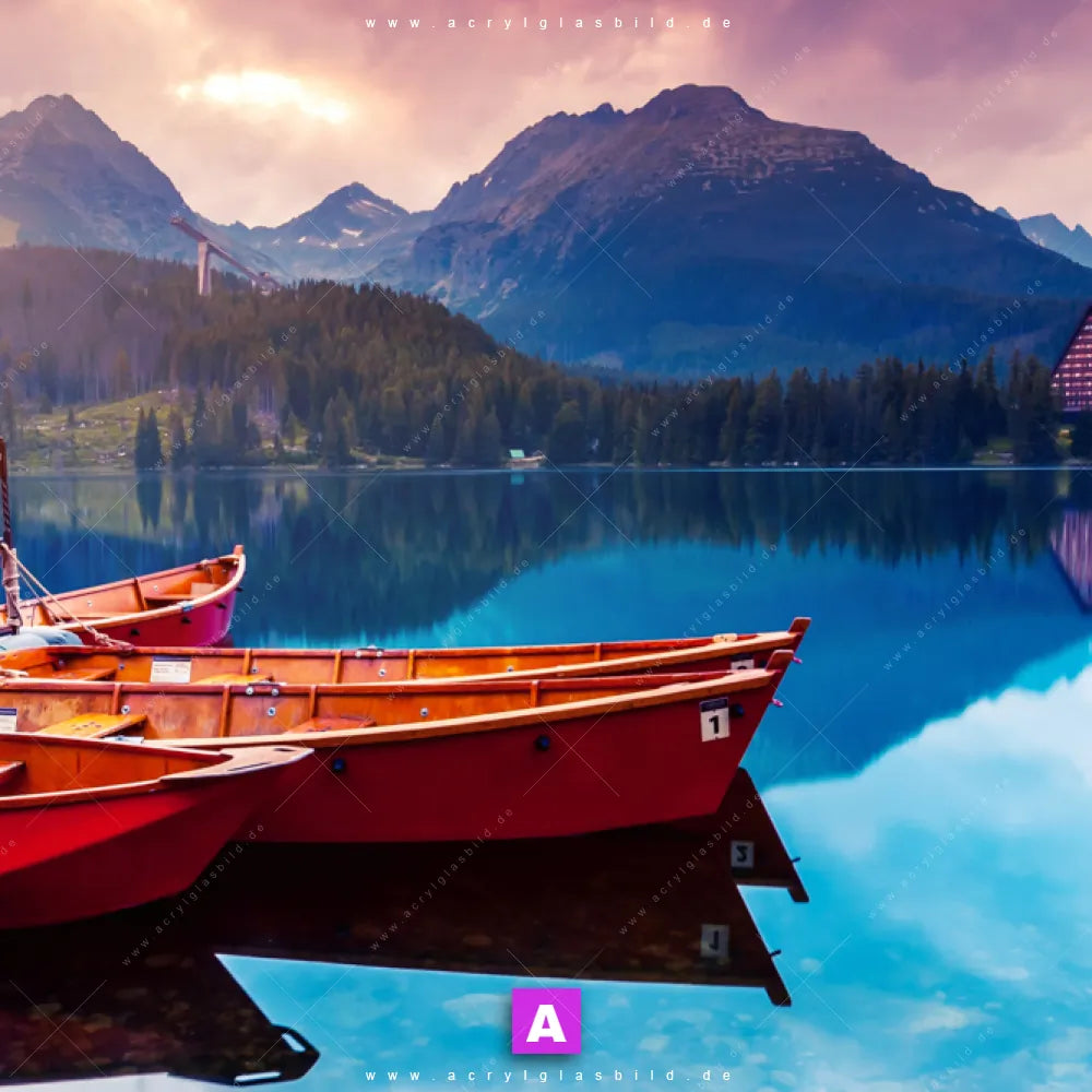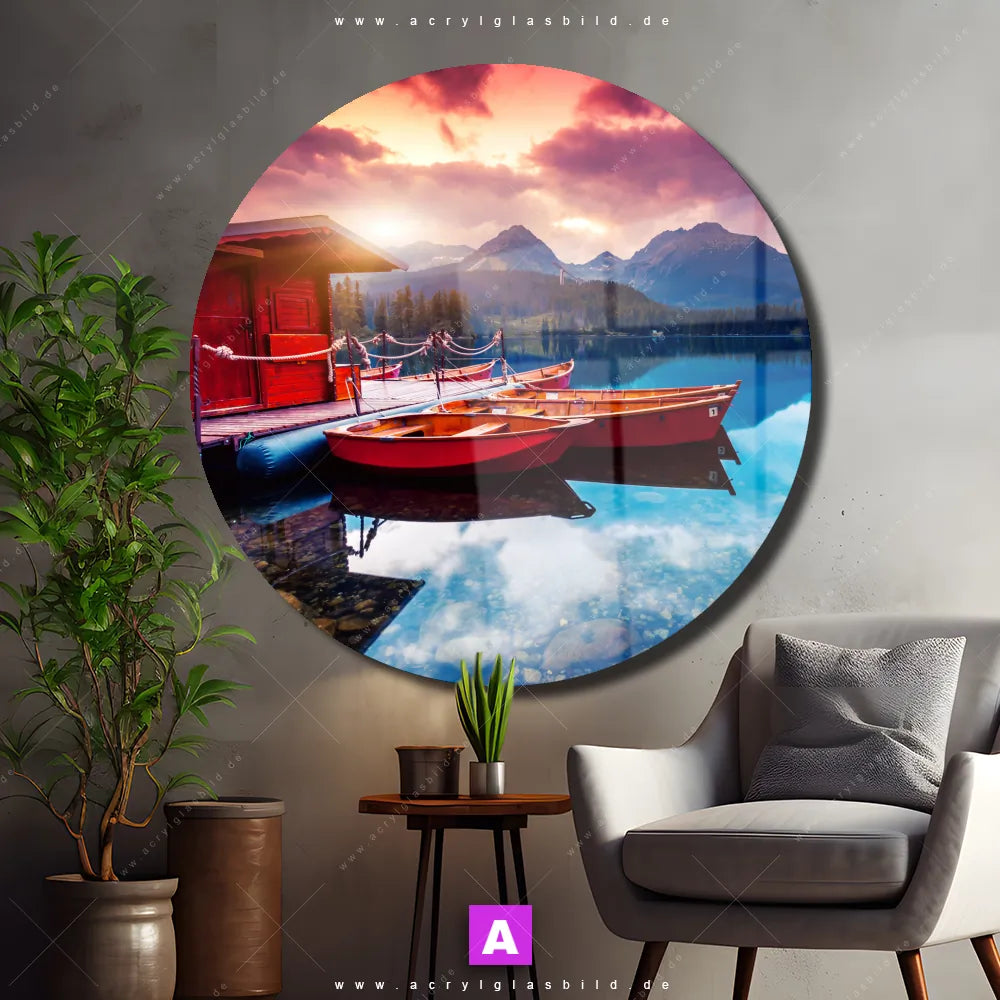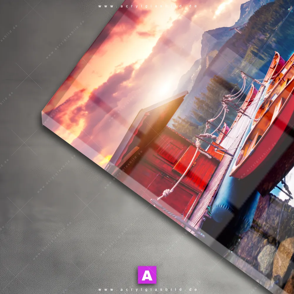 Das Beste daran ist, dass unser Acrylglasbild Boote mit Holzhütte am See im Stil Natürlich - Realistisch, Mixed Media perfekt zu jedem Einrichtungsstil passt. Gestaltet als Fotografie, Digitale Kunst, bringt es nicht nur deine Wand, sondern auch dein Herz zum Strahlen.