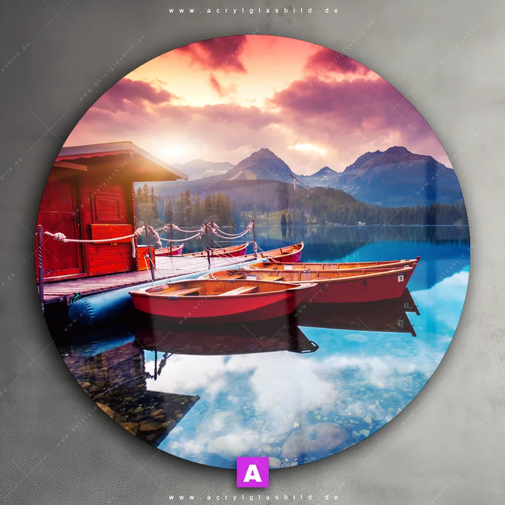 <b>Produktart:</b> Acrylglasbild | Glasbild | Wandbild aus Kunstglas | <b> Motiv:</b> Ruhiger Bergsee | <b> Bildausrichtung:</b> Rund | <b> Max. Motiv-Größe:</b> 450cm breit | 300cm hoch | <b> Verfügbare Formate: </b> Quadrat, Querformat, Hochformat, Panorama, Schmal, Rund | <b> Kategorie:</b> Landschaften | <b> Farben:</b> Orange, Blau, Rot | <b> Kunstformen:</b> Fotografie, Digitale Kunst | <b> Kunststile:</b> Natürlich - Realistisch, Mixed Media
