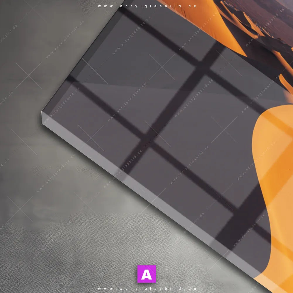 Das Motiv Sanddünen wird im UV-Direktdruck in den Farben Orange, Schwarz, Braun, Beige, Ocker auf die Rückseite einer 5mm starken, transparenten Acrylglasplatte gedruckt. Das durchscheinende Motiv Sahara im Natürlich - Realistisch Stil wird anschließend vollflächig mit einer weißen Schicht hinterlegt. Das Landschaften Acrylglasbild | Querformat erhält so eine bemerkenswerte Farbbrillanz, hohe Schärfe und erstaunliche Tiefenwirkung.