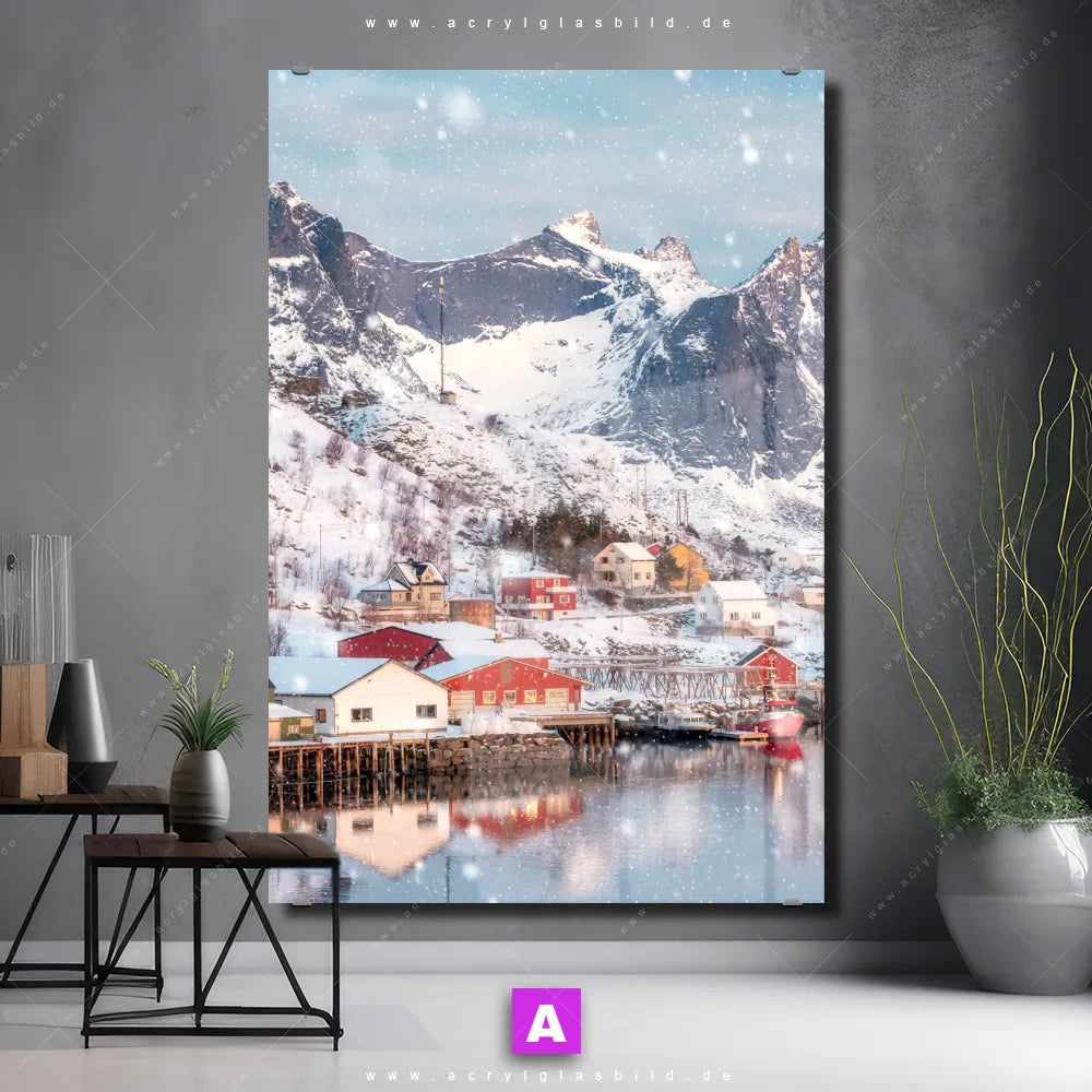 Hallo, auf Wiedersehen langweilige Wände! Gib deinem Raum ein stilvolles Upgrade mit unserem Acrylglasbild Skandinavisches Dorf im Schnee im Hochformat, das nicht nur Flur - Eingangsbereich, Wohnzimmer - Schlafzimmer, Büro - Kanzlei, sondern auch jeden anderen Raum im Handumdrehen auf ein neues Niveau hebt!