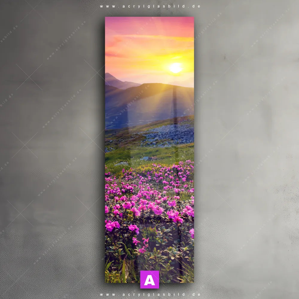 Die einzigartigen Farben in Blau, Bunt, Grün, Hellblau, Hellgrün, Lila, Orange, Pink, Rot, Rosa machen das Acrylglasbild blühende Wiese in den Bergen mit Berge, Sonnenuntergang, Bergwiese, Sommer, Blumen, Blumenwiese zu einem echten Hingucker. Egal ob deine Einrichtung minimalistisch, modern oder doch eher wild und ausgefallen ist - unser Acrylglasbild Bergwiese im Sonnenuntergang im Natürlich - Realistisch Stil passt immer, auch in Küche - Esszimmer, Arzt - Praxis, Flur - Eingangsbereich, Büro - Kanzlei.