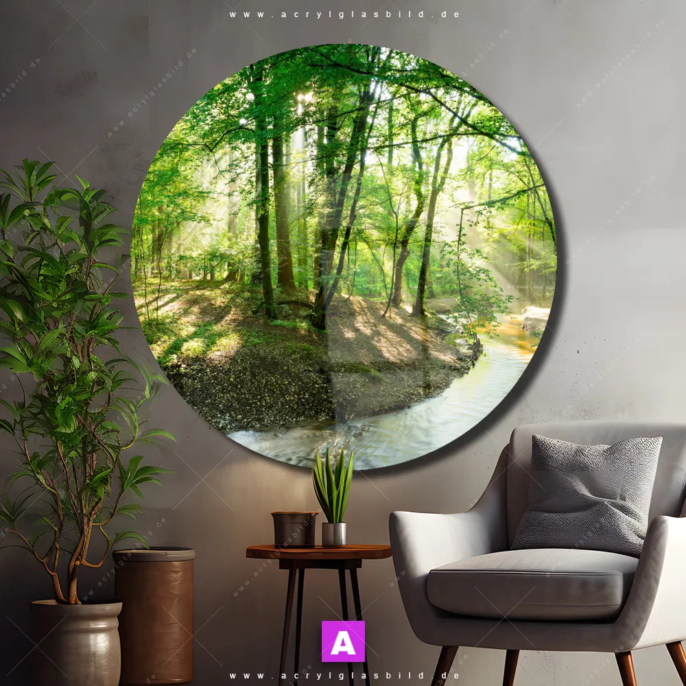 Hey du! Bist du es auch leid, auf langweilige, weiße Wände in deinem Raum zu starren und dich zu fragen, ob das der Sinn des Lebens ist? Unser Acrylglasbild mit dem Titel Wald mit Bach im Format Rund verwandelt deine Wand in ein Kunstwerk und macht deinen Raum zum absoluten Hingucker.