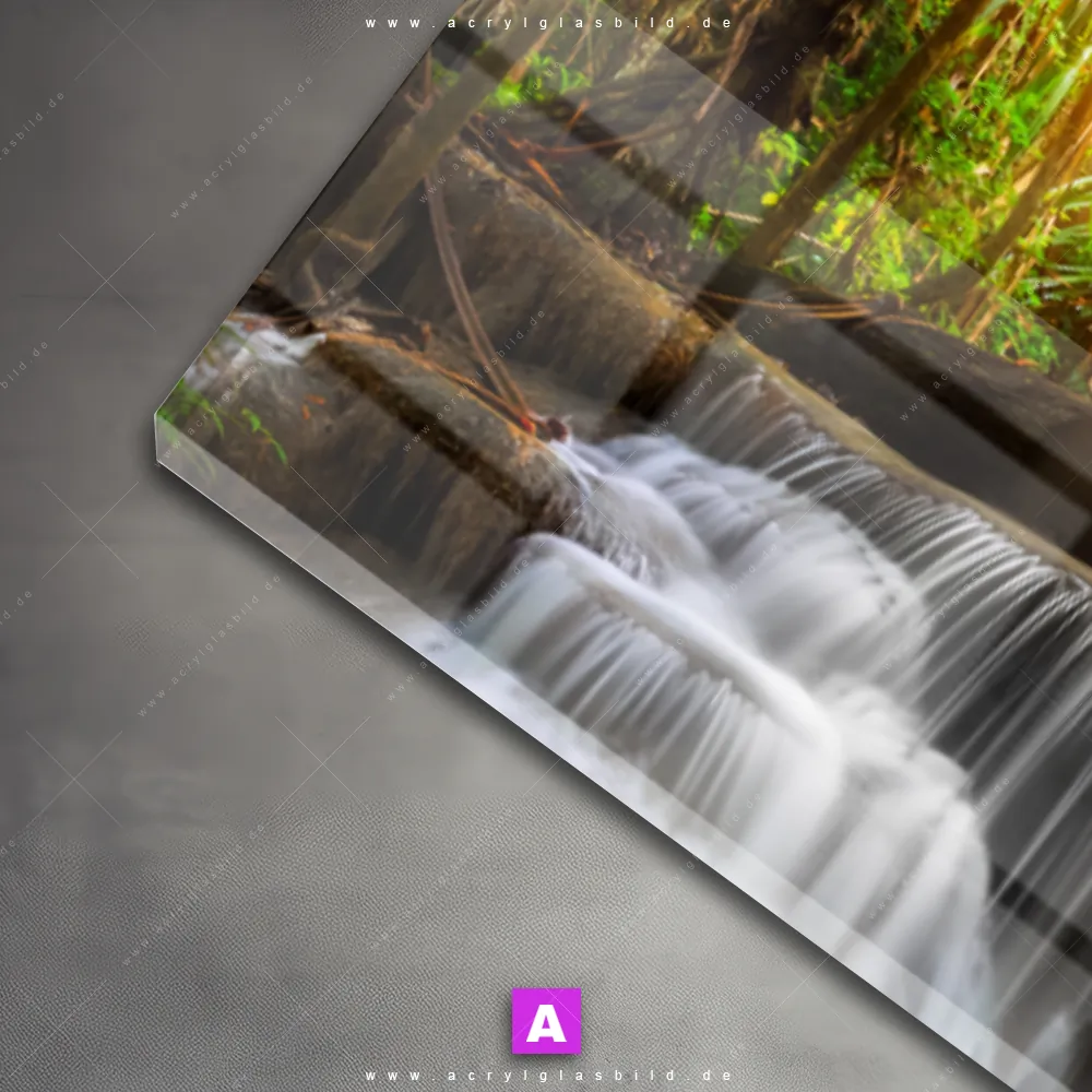Das Motiv Wald & Wasserfall No. 2 wird im UV-Direktdruck in den Farben Türkis, Ocker, Gelb , Grün auf die Rückseite einer 5mm starken, transparenten Acrylglasplatte gedruckt. Das durchscheinende Motiv Waldwasserfall bei Tagesanbruch im Natürlich - Realistisch Stil wird anschließend vollflächig mit einer weißen Schicht hinterlegt. Das Landschaften, Wald - Bäume Acrylglasbild | Panorama erhält so eine bemerkenswerte Farbbrillanz, hohe Schärfe und erstaunliche Tiefenwirkung.