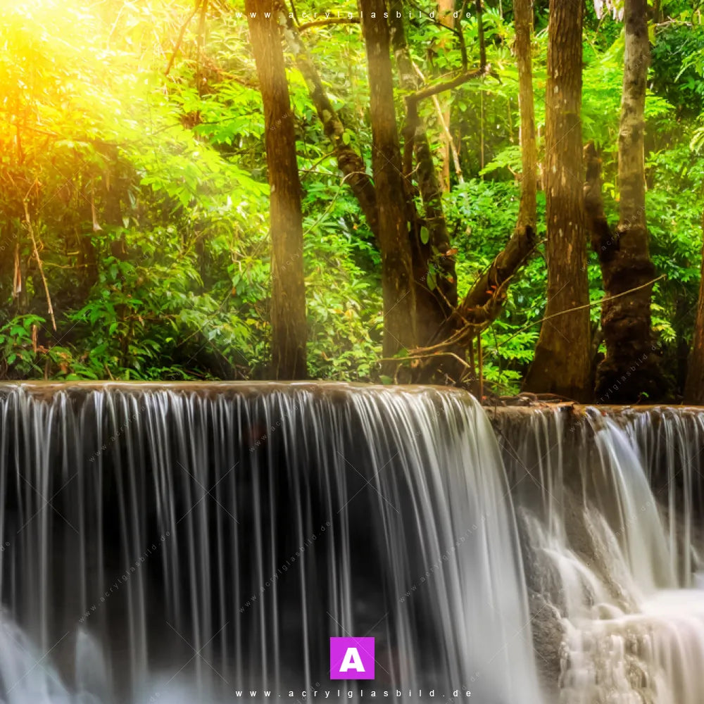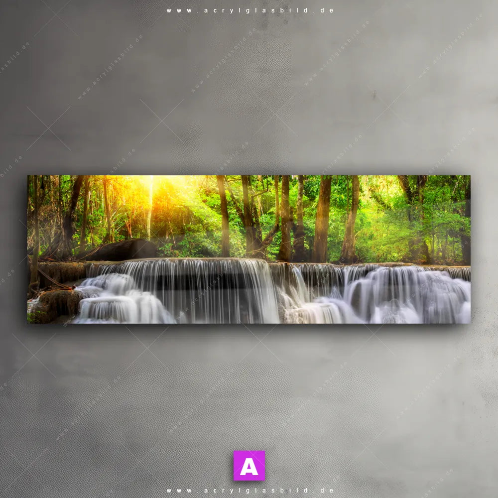 <b>Produktart:</b> Acrylglasbild | Glasbild | Wandbild aus Kunstglas | <b> Motiv:</b> Wald & Wasserfall No. 2 | <b> Bildausrichtung:</b> Panorama | <b> Max. Motiv-Größe:</b> 270cm breit | 180cm hoch | <b> Verfügbare Formate: </b> Quadrat, Querformat, Hochformat, Panorama, Schmal, Rund | <b> Kategorie:</b> Landschaften, Wald - Bäume | <b> Farben:</b> Türkis, Ocker, Gelb , Grün | <b> Kunstformen:</b> Fotografie | <b> Kunststile:</b> Natürlich - Realistisch