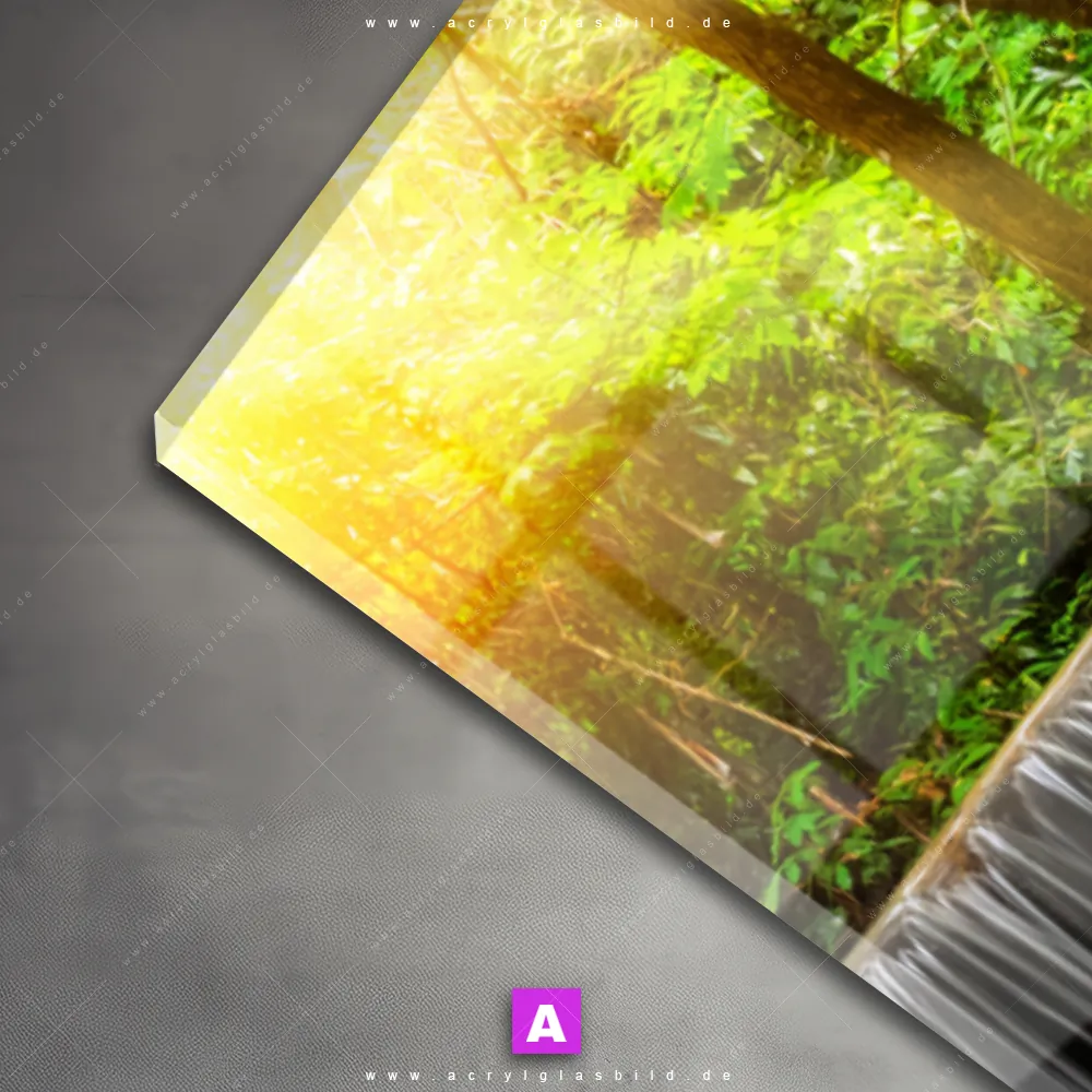 Das Motiv Wald & Wasserfall No. 2 wird im UV-Direktdruck in den Farben Türkis, Ocker, Gelb , Grün auf die Rückseite einer 5mm starken, transparenten Acrylglasplatte gedruckt. Das durchscheinende Motiv Waldwasserfall bei Tagesanbruch im Natürlich - Realistisch Stil wird anschließend vollflächig mit einer weißen Schicht hinterlegt. Das Landschaften, Wald - Bäume Acrylglasbild | Schmal erhält so eine bemerkenswerte Farbbrillanz, hohe Schärfe und erstaunliche Tiefenwirkung.