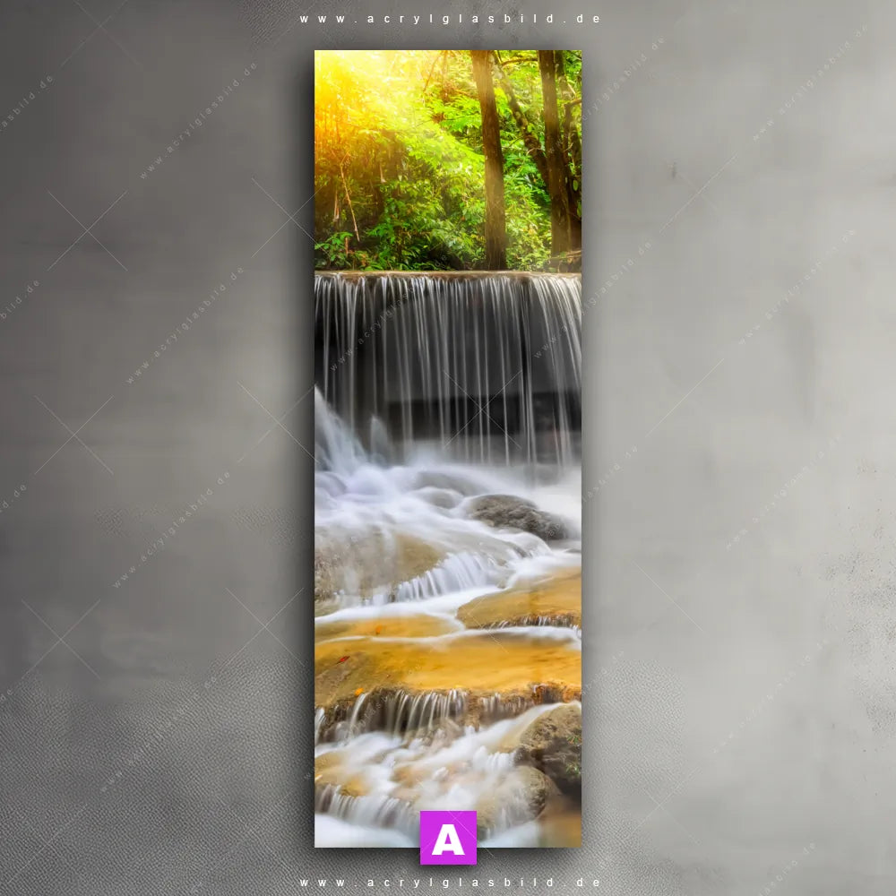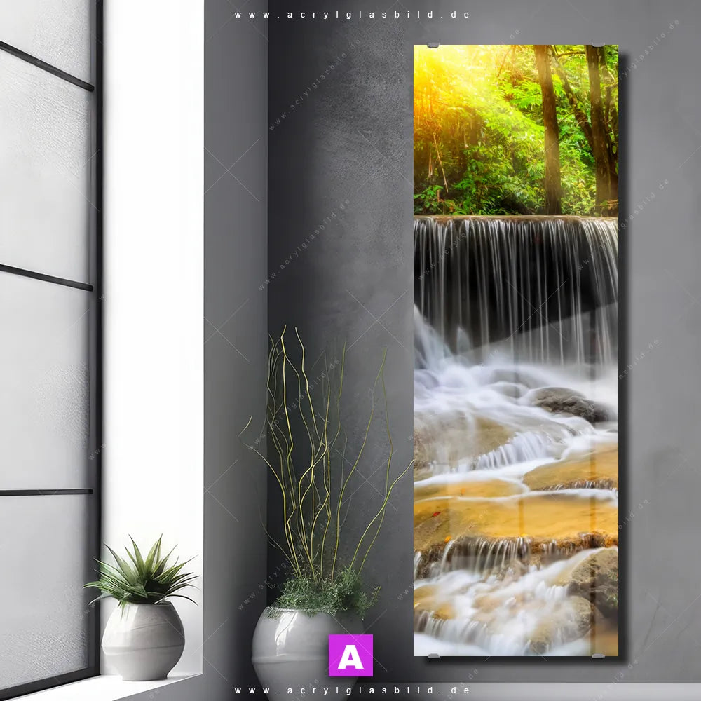 <b>Produktart:</b> Acrylglasbild | Glasbild | Wandbild aus Kunstglas | <b> Motiv:</b> Wald & Wasserfall No. 2 | <b> Bildausrichtung:</b> Schmal | <b> Max. Motiv-Größe:</b> 270cm breit | 180cm hoch | <b> Verfügbare Formate: </b> Quadrat, Querformat, Hochformat, Panorama, Schmal, Rund | <b> Kategorie:</b> Landschaften, Wald - Bäume | <b> Farben:</b> Türkis, Ocker, Gelb , Grün | <b> Kunstformen:</b> Fotografie | <b> Kunststile:</b> Natürlich - Realistisch