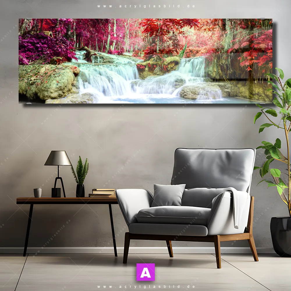 <b>Produktart:</b> Acrylglasbild | Glasbild | Wandbild aus Kunstglas | <b> Motiv:</b> Wald & Wasserfall No. 3 | <b> Bildausrichtung:</b> Panorama | <b> Max. Motiv-Größe:</b> 300cm breit | 200cm hoch | <b> Verfügbare Formate: </b> Quadrat, Querformat, Hochformat, Panorama, Schmal, Rund | <b> Kategorie:</b> Landschaften | <b> Farben:</b> Türkis, Pink, Rot, Lila | <b> Kunstformen:</b> Fotografie | <b> Kunststile:</b> Natürlich - Realistisch