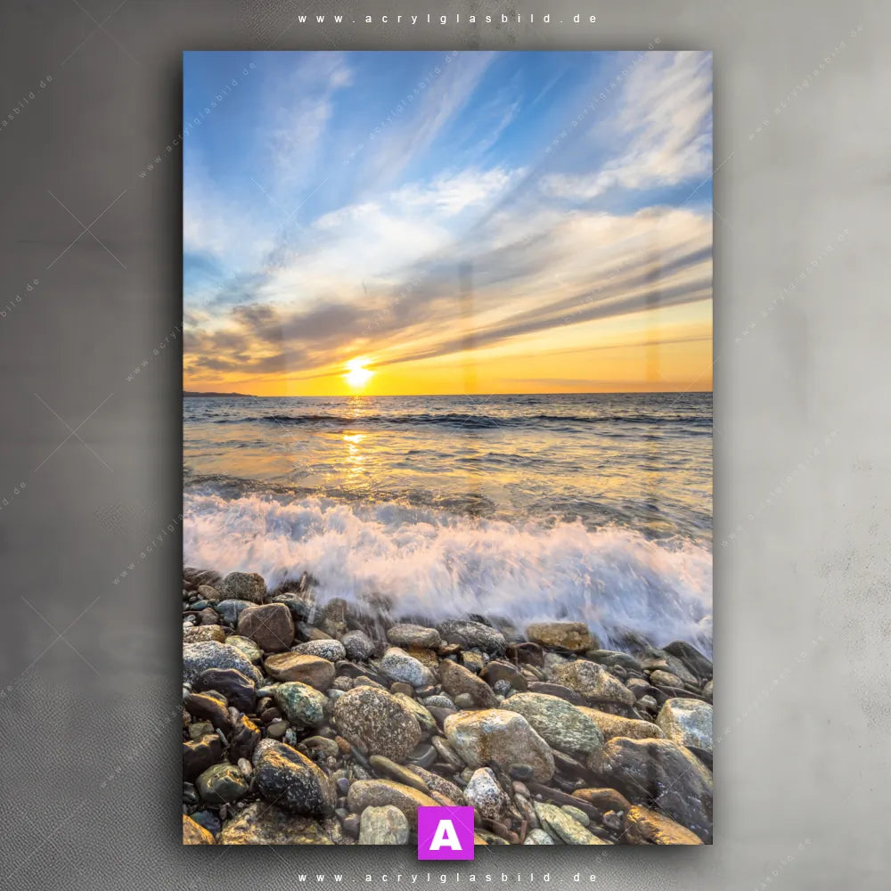 Wenn du auf der Suche nach einem Wandkunstwerk bist, das deine Sinne anregt und deine kreative Seite erweckt, dann ist unser Acrylglasbild Kiesstrand im Sonnenuntergang aus der Kategorie Strand - Meer, Landschaften die perfekte Wahl für dich. Entscheide dich für das Acrylglasbild Wellen treffen auf Kiesstrand in den faszinierenden Farben Blau, Hellblau, Orange, Beige, da es ideal zu deinem Einrichtungsstil im Natürlich - Realistisch-Look passt.