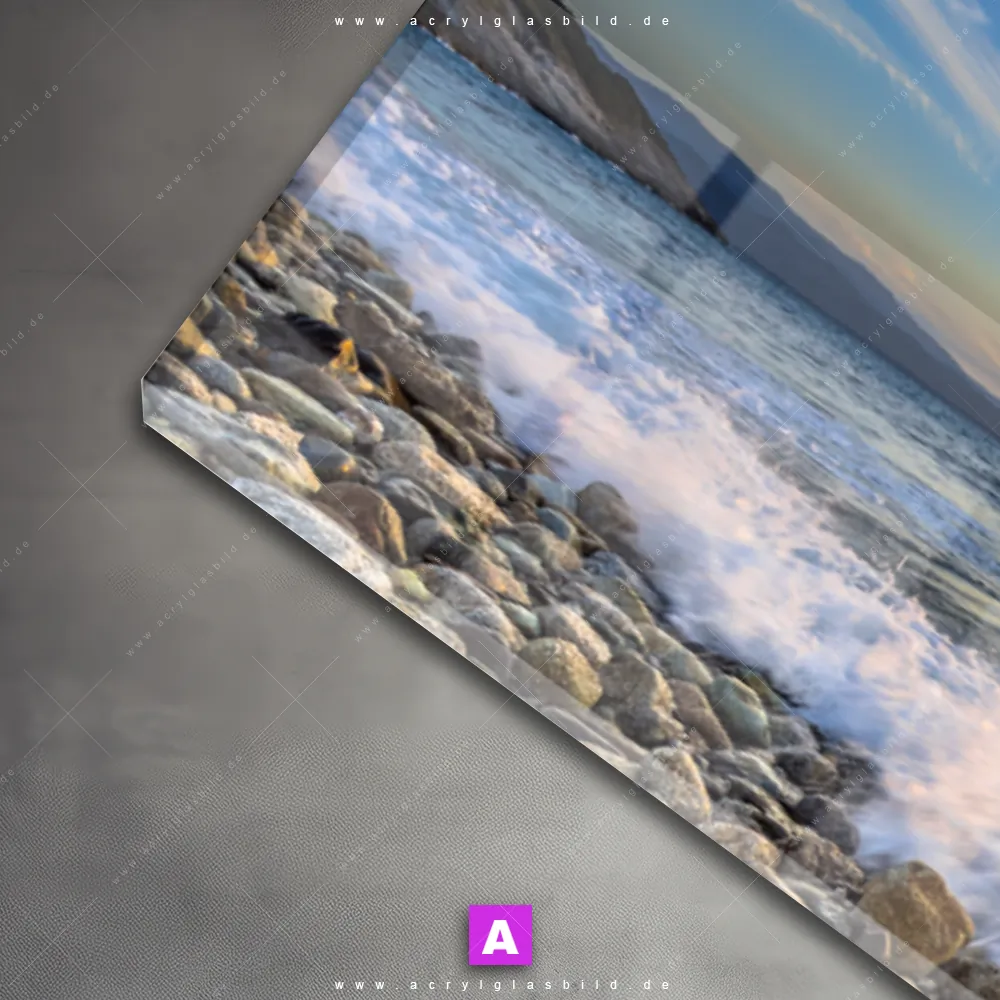 Das Motiv Wellen des Meeres wird im UV-Direktdruck in den Farben Blau, Hellblau, Orange, Beige auf die Rückseite einer 5mm starken, transparenten Acrylglasplatte gedruckt. Das durchscheinende Motiv Wellen treffen auf Kiesstrand im Natürlich - Realistisch Stil wird anschließend vollflächig mit einer weißen Schicht hinterlegt. Das Strand - Meer, Landschaften Acrylglasbild | Panorama erhält so eine bemerkenswerte Farbbrillanz, hohe Schärfe und erstaunliche Tiefenwirkung.