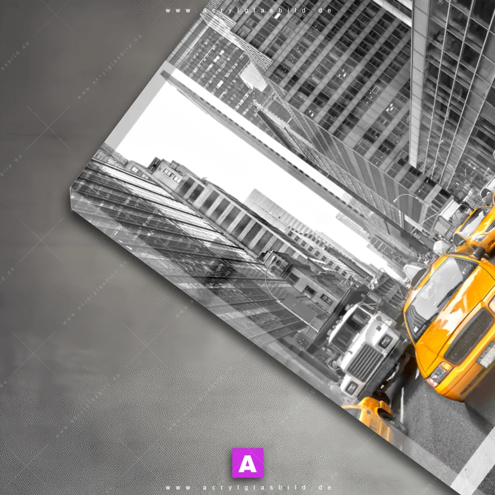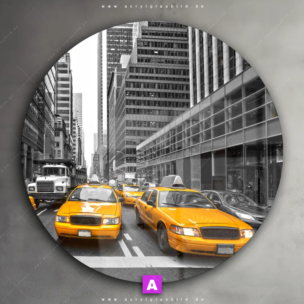 <b>Produktart:</b> Acrylglasbild | Glasbild | Wandbild aus Kunstglas | <b> Motiv:</b> Gelbe Taxis New York | <b> Bildausrichtung:</b> Rund | <b> Max. Motiv-Größe:</b> 450cm breit | 300cm hoch | <b> Verfügbare Formate: </b> Quadrat, Querformat, Hochformat, Panorama, Schmal, Rund | <b> Kategorie:</b> Fahrzeuge, Städte - Skylines | <b> Farben:</b> Weiss, Schwarz | <b> Kunstformen:</b> Fotografie | <b> Kunststile:</b> Natürlich - Realistisch, Schwarz - Weiss