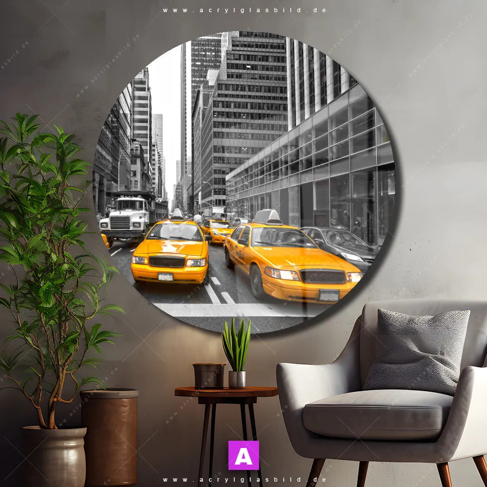 Hey du! Bist du es auch leid, auf langweilige, weiße Wände in deinem Raum zu starren und dich zu fragen, ob das der Sinn des Lebens ist? Unser Acrylglasbild mit dem Titel Gelbe Taxis New York im Format Rund verwandelt deine Wand in ein Kunstwerk und macht deinen Raum zum absoluten Hingucker.