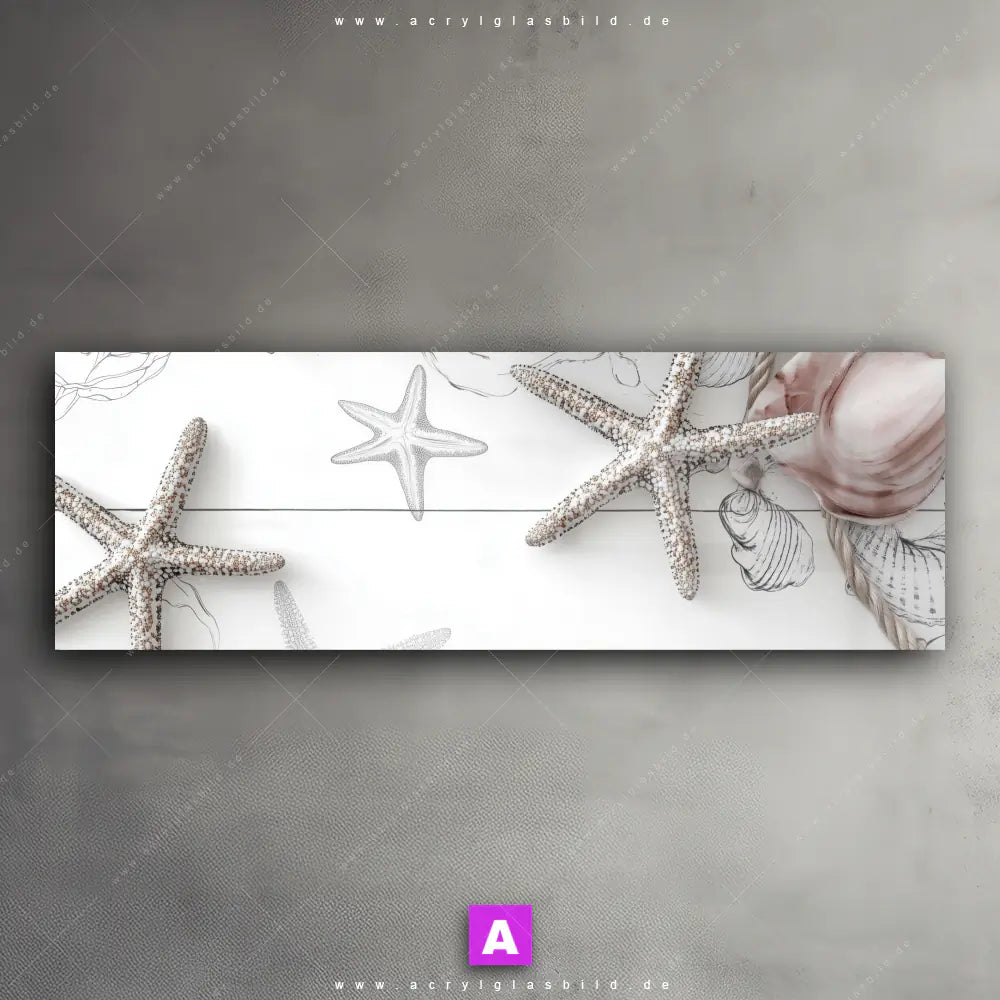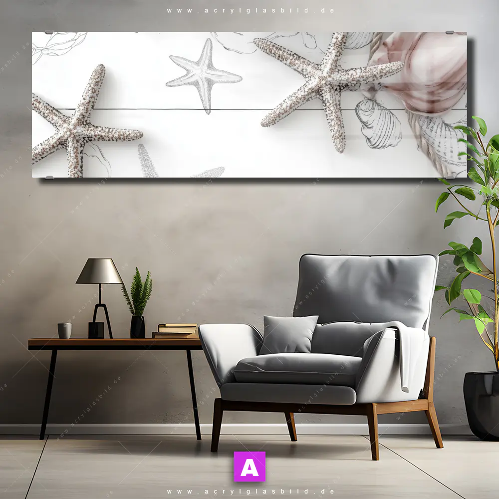 Fehlt dir die Inspiration beim Anblick deiner Wände, sodass selbst das Zählen der Wandfarbtropfen aufregender erscheint? Keine Sorge, wir haben das perfekte Kunstwerk für dich! Mit unserem Acrylglasbild Küstenfeeling - Muschel im Panorama-Format verleihst du deinem Raum den dringend benötigten Wow-Faktor. Lass deine Wände mit unserem Seestern Deko Illustration Acrylglasbild zum Star werden!