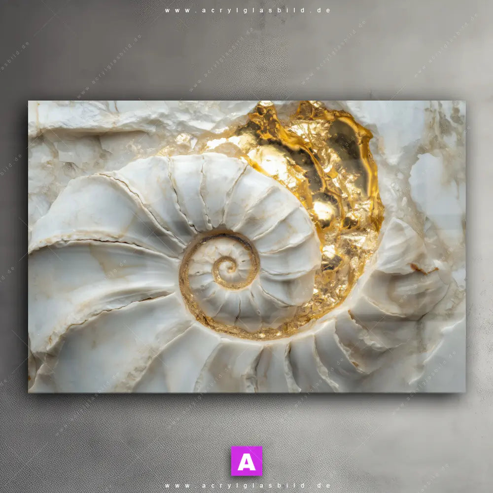 <b>Produktart:</b> Acrylglasbild | Glasbild | Wandbild aus Kunstglas | <b> Motiv:</b> Muschelspirale mit Gold | <b> Bildausrichtung:</b> Querformat | <b> Max. Motiv-Größe:</b> 450cm breit | 300cm hoch | <b> Verfügbare Formate: </b> Quadrat, Querformat, Hochformat, Panorama, Schmal, Rund | <b> Kategorie:</b> Muster - Texturen, Strand - Meer | <b> Farben:</b> Gold, Beige, Weiss | <b> Kunstformen:</b> Digitale Kunst, Fotografie | <b> Kunststile:</b> Abstrakt, Modern Art