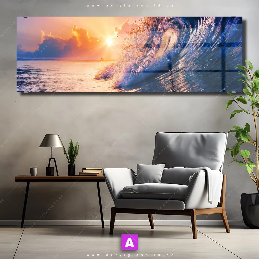 Fehlt dir die Inspiration beim Anblick deiner Wände, sodass selbst das Zählen der Wandfarbtropfen aufregender erscheint? Keine Sorge, wir haben das perfekte Kunstwerk für dich! Mit unserem Acrylglasbild Welle im Sonnenuntergang im Panorama-Format verleihst du deinem Raum den dringend benötigten Wow-Faktor. Lass deine Wände mit unserem Surferwelle Acrylglasbild zum Star werden!