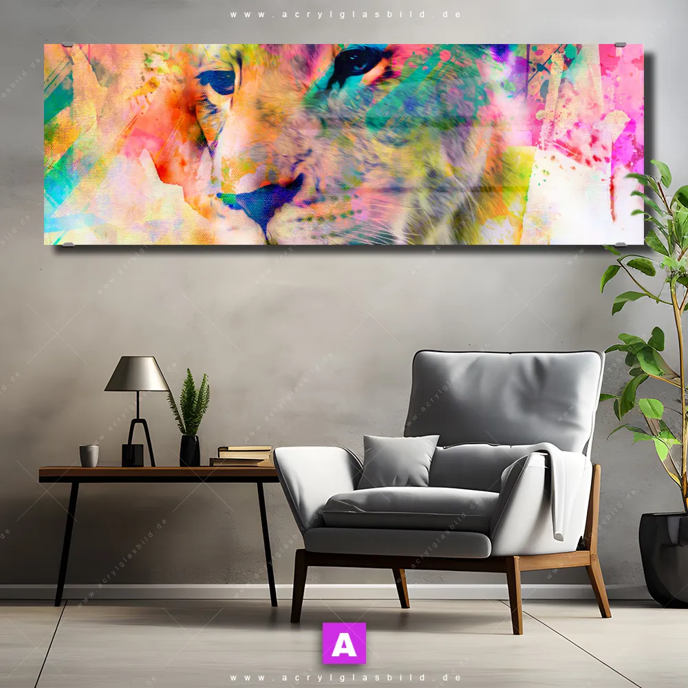 <b>Produktart:</b> Acrylglasbild | Glasbild | Wandbild aus Kunstglas | <b> Motiv:</b> Abstrakte Löwin | <b> Bildausrichtung:</b> Panorama | <b> Max. Motiv-Größe:</b> 300cm breit | 210cm hoch | <b> Verfügbare Formate: </b> Quadrat, Querformat, Hochformat, Panorama, Schmal, Rund | <b> Kategorie:</b> Tierwelt | <b> Farben:</b> Bunt | <b> Kunstformen:</b> Kunst - Malerei | <b> Kunststile:</b> Abstrakt, Modern Art, Pop Art, Street Art