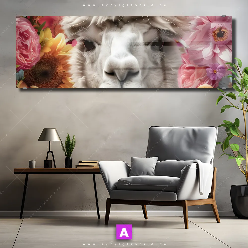 Acrylglasbild | Alpaka mit Blumen | Panorama