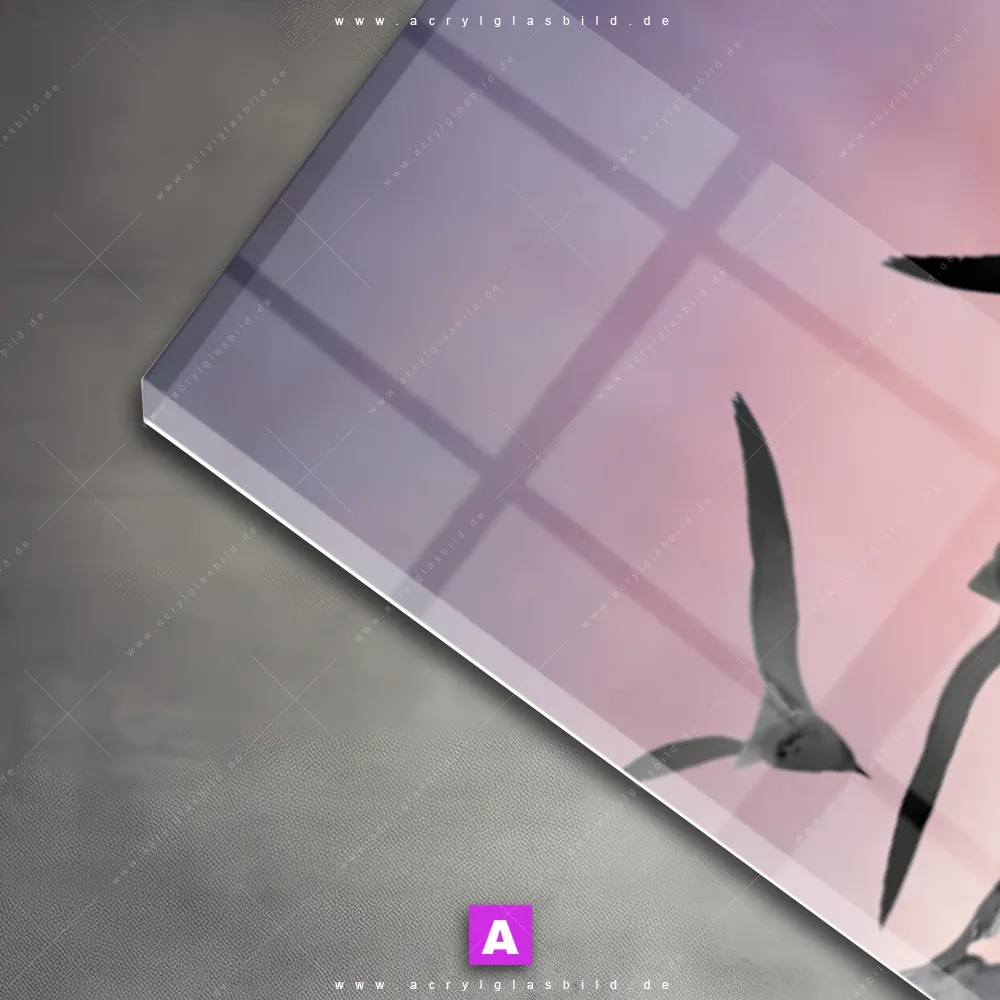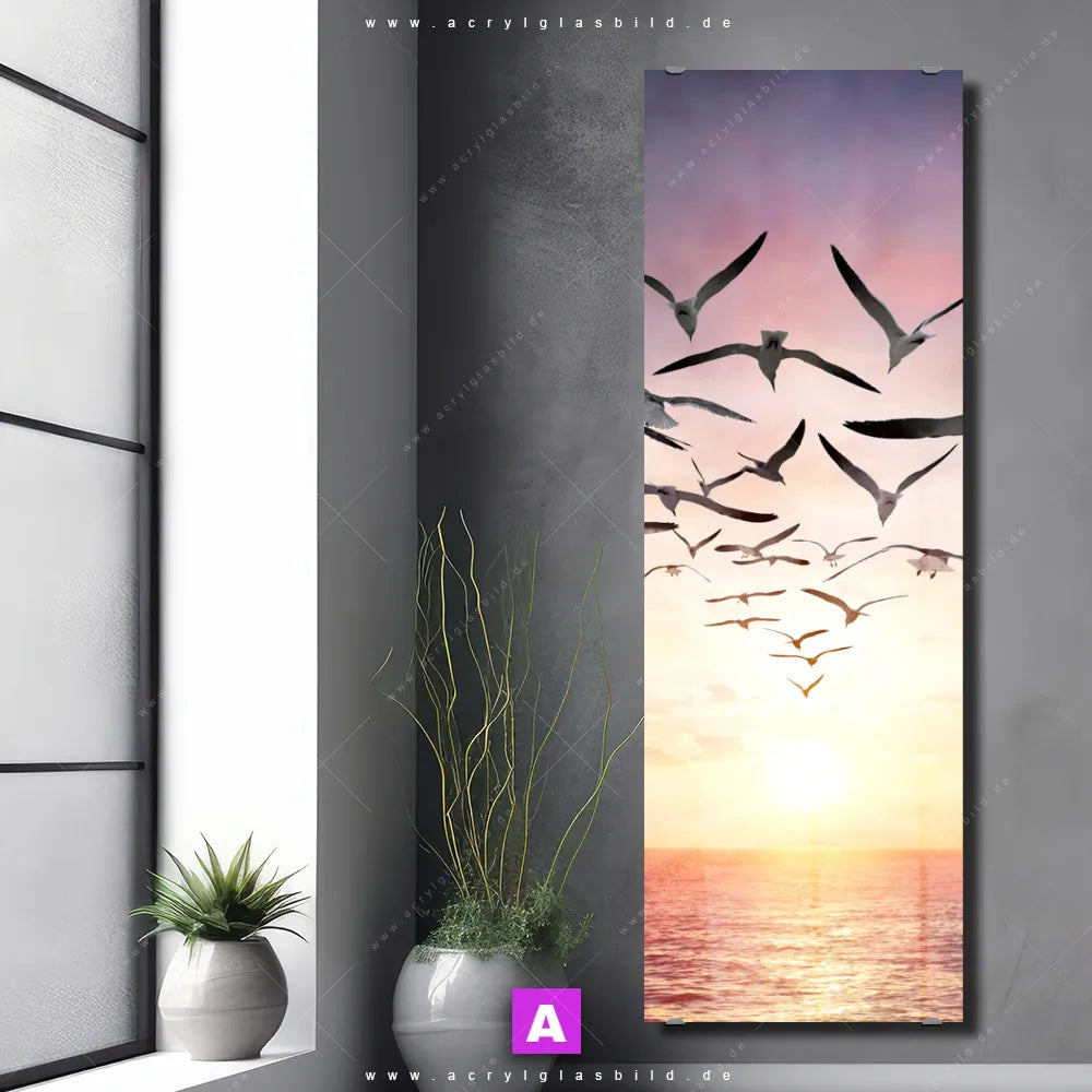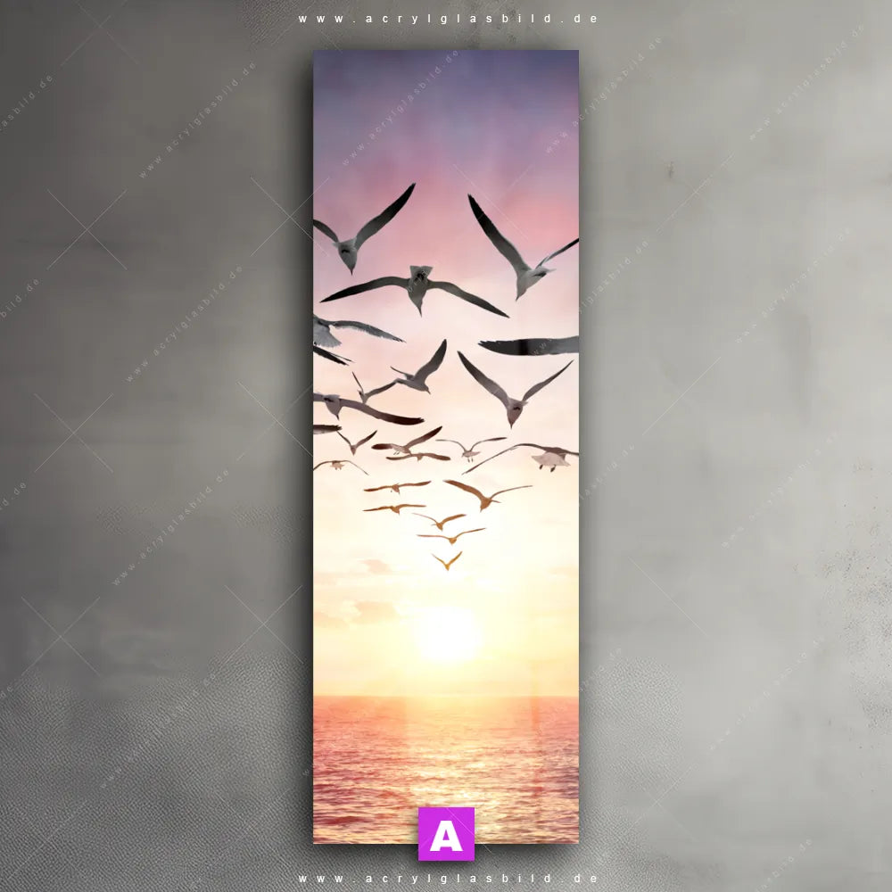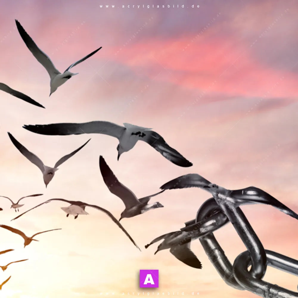 Die einzigartigen Farben in Orange, Rot, Lila machen das Acrylglasbild Fliegen über dem Wasser mit Meer, Sonnenuntergang, Vogel, Freiheit, Möwe, Kette, Reise zu einem echten Hingucker. Egal ob deine Einrichtung minimalistisch, modern oder doch eher wild und ausgefallen ist - unser Acrylglasbild Befreiung im Modern Art, Surreal - Fantasy Stil passt immer, auch in Arzt - Praxis, Wohnzimmer - Schlafzimmer, Flur - Eingangsbereich.