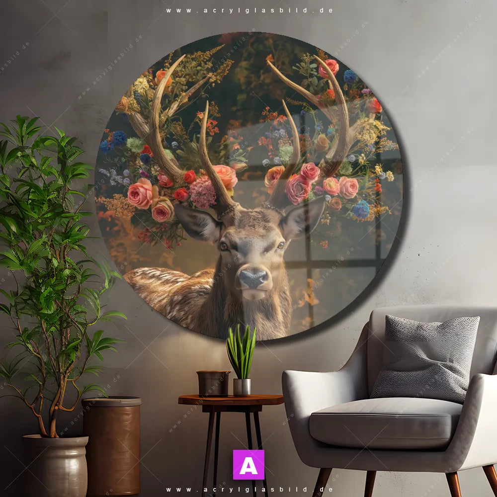 Hey du! Bist du es auch leid, auf langweilige, weiße Wände in deinem Raum zu starren und dich zu fragen, ob das der Sinn des Lebens ist? Unser Acrylglasbild mit dem Titel Hirsch mit floralem Geweih im Format Rund verwandelt deine Wand in ein Kunstwerk und macht deinen Raum zum absoluten Hingucker.