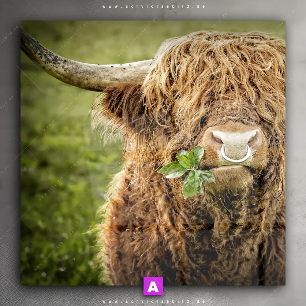 <b>Produktart:</b> Acrylglasbild | Glasbild | Wandbild aus Kunstglas | <b> Motiv:</b> Hochland-Rind mit Nasenring | <b> Bildausrichtung:</b> Quadrat | <b> Max. Motiv-Größe:</b> 270cm breit | 180cm hoch | <b> Verfügbare Formate: </b> Quadrat, Querformat, Hochformat, Panorama, Schmal, Rund | <b> Kategorie:</b> Tierwelt | <b> Farben:</b> Braun, Beige, Grün | <b> Kunstformen:</b> Fotografie | <b> Kunststile:</b> Modern Art, Natürlich - Realistisch