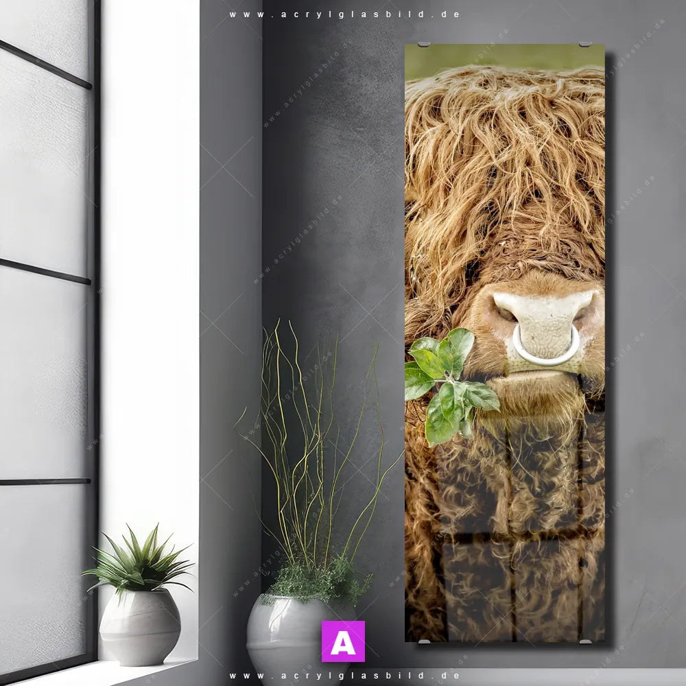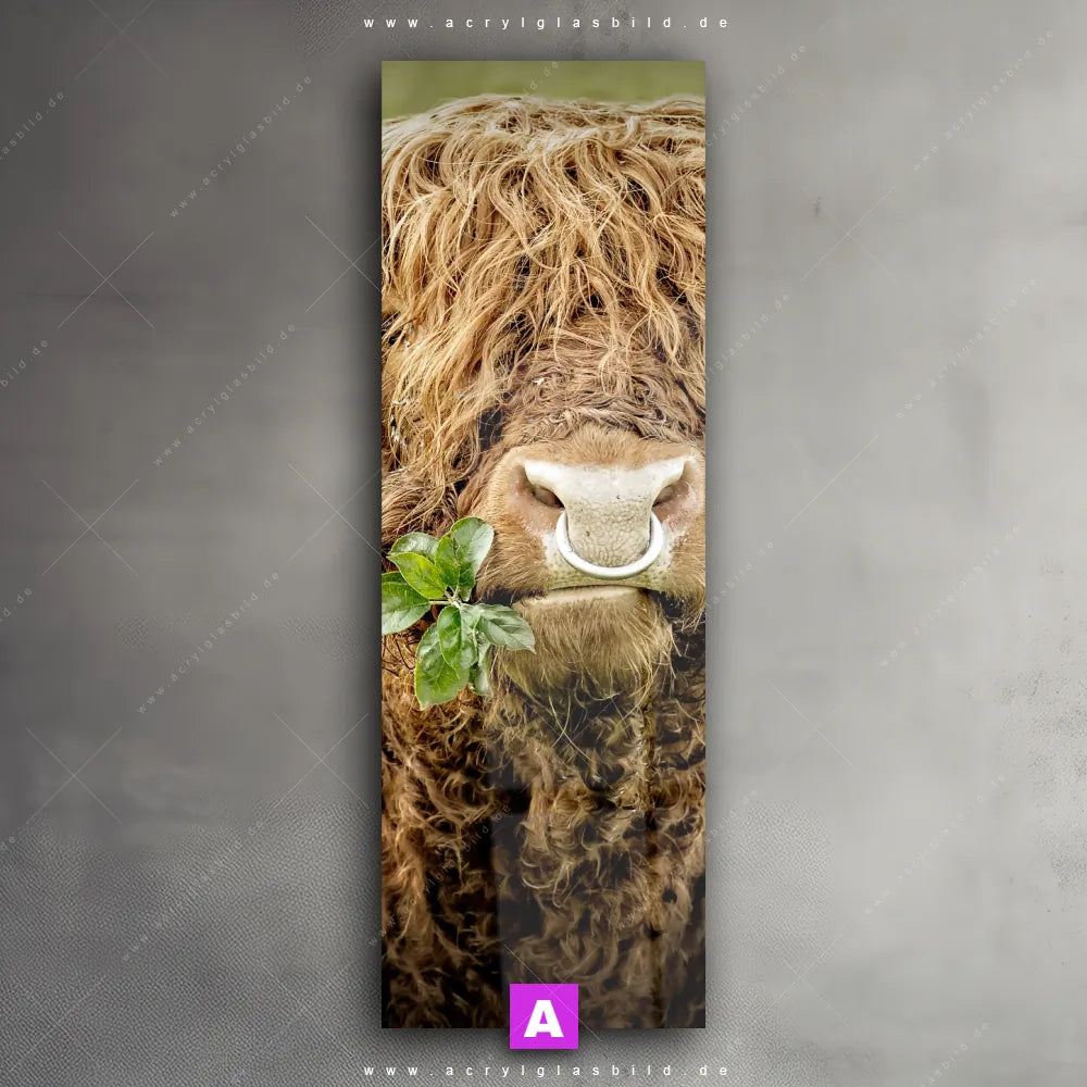 <b>Produktart:</b> Acrylglasbild | Glasbild | Wandbild aus Kunstglas | <b> Motiv:</b> Hochland-Rind mit Nasenring | <b> Bildausrichtung:</b> Schmal | <b> Max. Motiv-Größe:</b> 270cm breit | 180cm hoch | <b> Verfügbare Formate: </b> Quadrat, Querformat, Hochformat, Panorama, Schmal, Rund | <b> Kategorie:</b> Tierwelt | <b> Farben:</b> Braun, Beige, Grün | <b> Kunstformen:</b> Fotografie | <b> Kunststile:</b> Modern Art, Natürlich - Realistisch