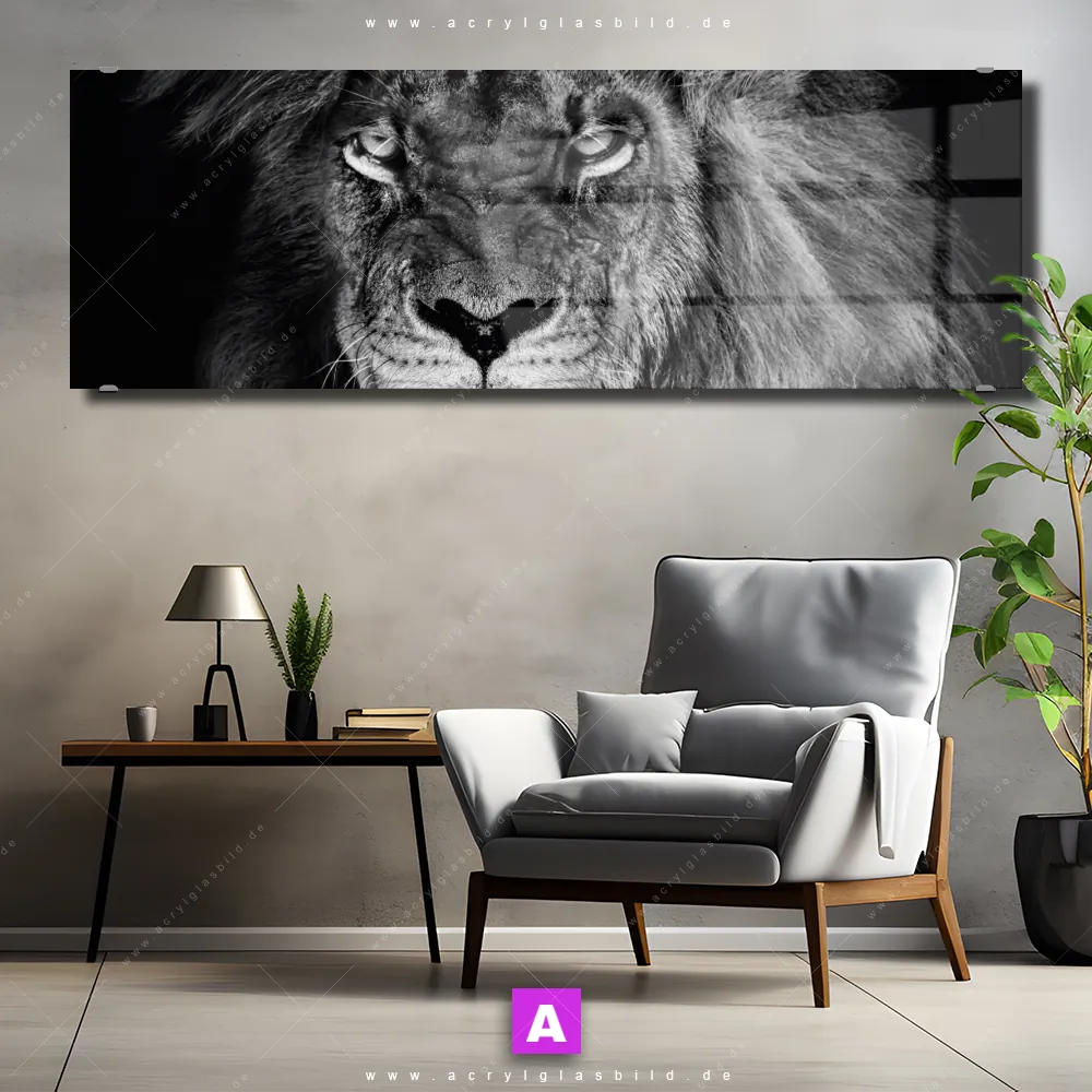 <b>Produktart:</b> Acrylglasbild | Glasbild | Wandbild aus Kunstglas | <b> Motiv:</b> Löwe Schwarzweiß | <b> Bildausrichtung:</b> Panorama | <b> Max. Motiv-Größe:</b> 216cm breit | 270cm hoch | <b> Verfügbare Formate: </b> Quadrat, Querformat, Hochformat, Panorama, Schmal, Rund | <b> Kategorie:</b>  Tierwelt | <b> Farben:</b>  Weiss, Schwarz | <b> Kunstformen:</b>  Fotografie | <b> Kunststile:</b>  Natürlich - Realistisch, Schwarz - Weiss