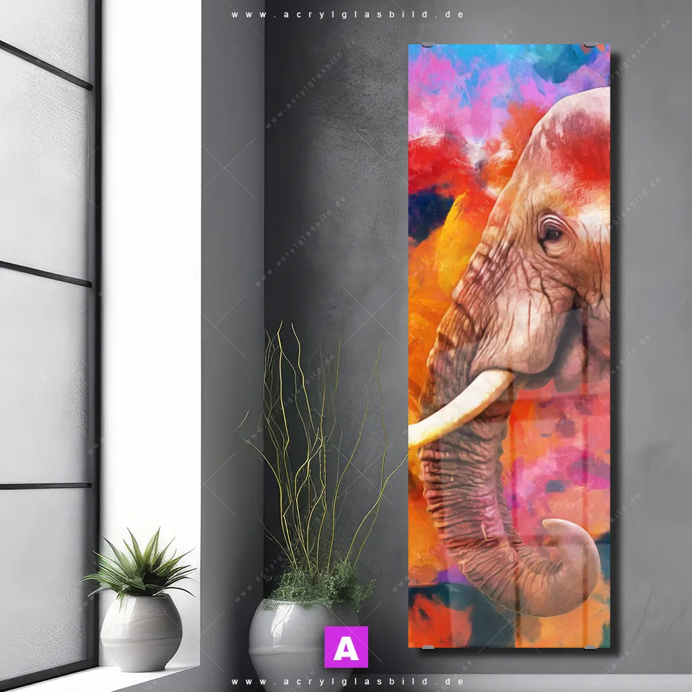 <b>Produktart:</b> Acrylglasbild | Glasbild | Wandbild aus Kunstglas | <b> Motiv:</b> Moderner Bunter Elefant | <b> Bildausrichtung:</b> Schmal | <b> Max. Motiv-Größe:</b> 270cm breit | 270cm hoch | <b> Verfügbare Formate: </b> Quadrat, Querformat, Hochformat, Panorama, Schmal, Rund | <b> Kategorie:</b> Tierwelt | <b> Farben:</b> Bunt | <b> Kunstformen:</b> Digitale Kunst, Kunst - Malerei | <b> Kunststile:</b> Abstrakt, Modern Art, Pop Art