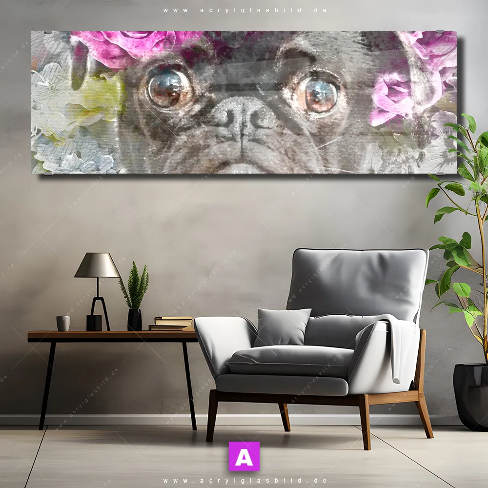 Fehlt dir die Inspiration beim Anblick deiner Wände, sodass selbst das Zählen der Wandfarbtropfen aufregender erscheint? Keine Sorge, wir haben das perfekte Kunstwerk für dich! Mit unserem Acrylglasbild Mops & Blumen im Panorama-Format verleihst du deinem Raum den dringend benötigten Wow-Faktor. Lass deine Wände mit unserem Mops umgeben von einem Aquarellblumen Acrylglasbild zum Star werden!