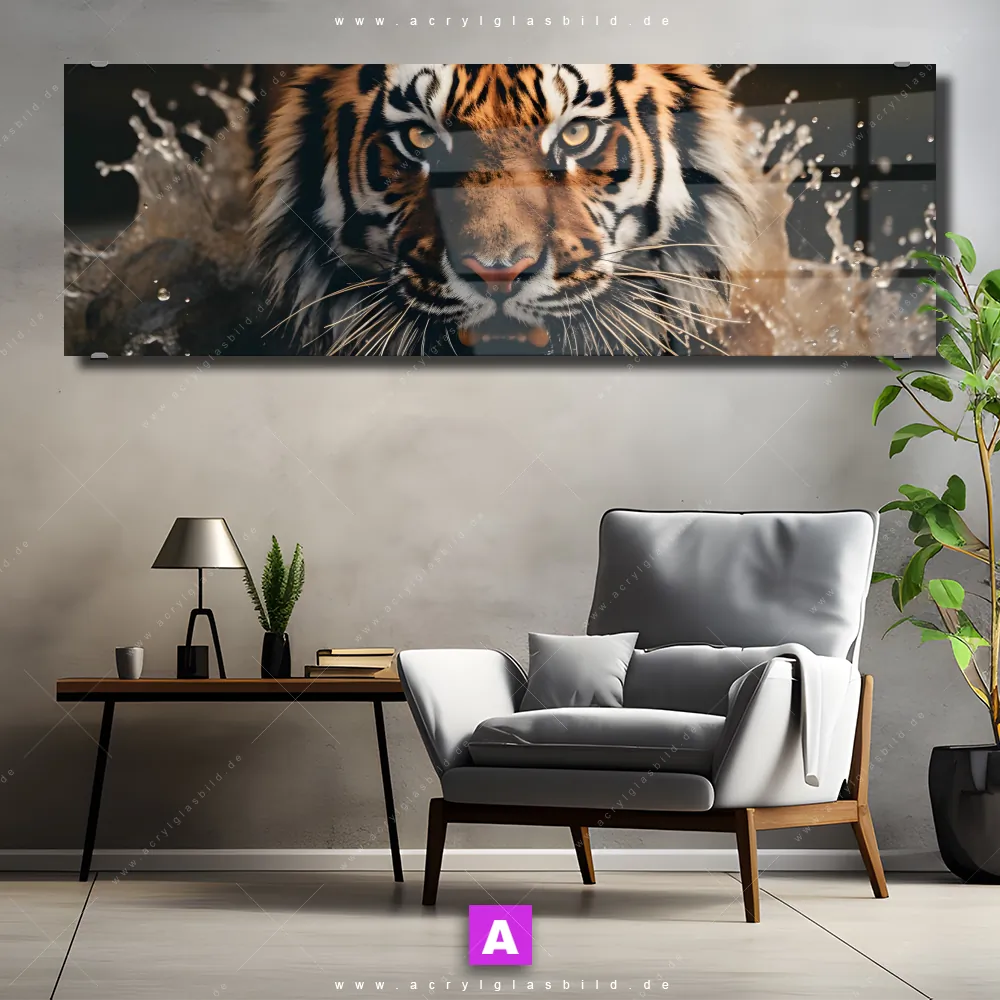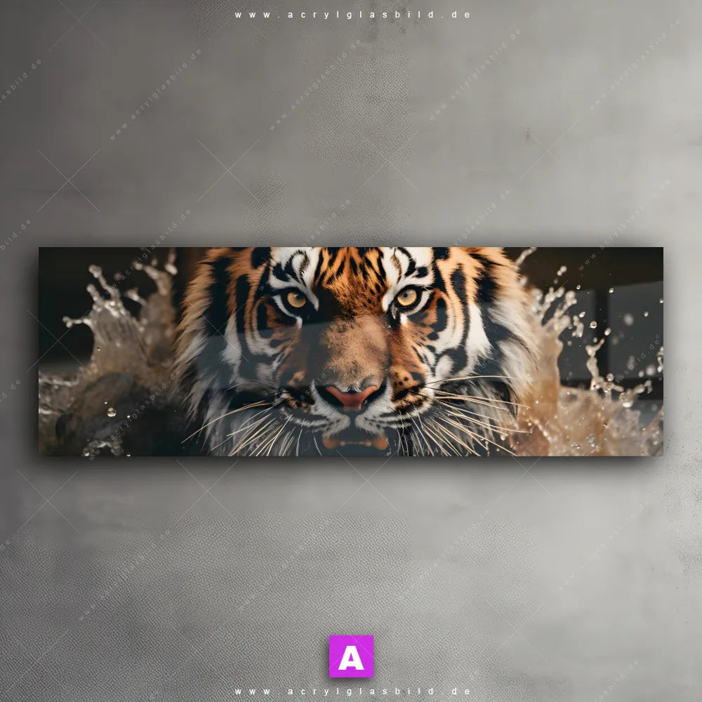 <b>Produktart:</b> Acrylglasbild | Glasbild | Wandbild aus Kunstglas | <b> Motiv:</b> Tiger im Wasser | <b> Bildausrichtung:</b> Panorama | <b> Max. Motiv-Größe:</b> 290cm breit | 180cm hoch | <b> Verfügbare Formate: </b> Quadrat, Querformat, Hochformat, Panorama, Schmal, Rund | <b> Kategorie:</b> Tierwelt | <b> Farben:</b> Braun, Beige, Schwarz | <b> Kunstformen:</b> Digitale Kunst, KI-generiertes Bild | <b> Kunststile:</b> Modern Art