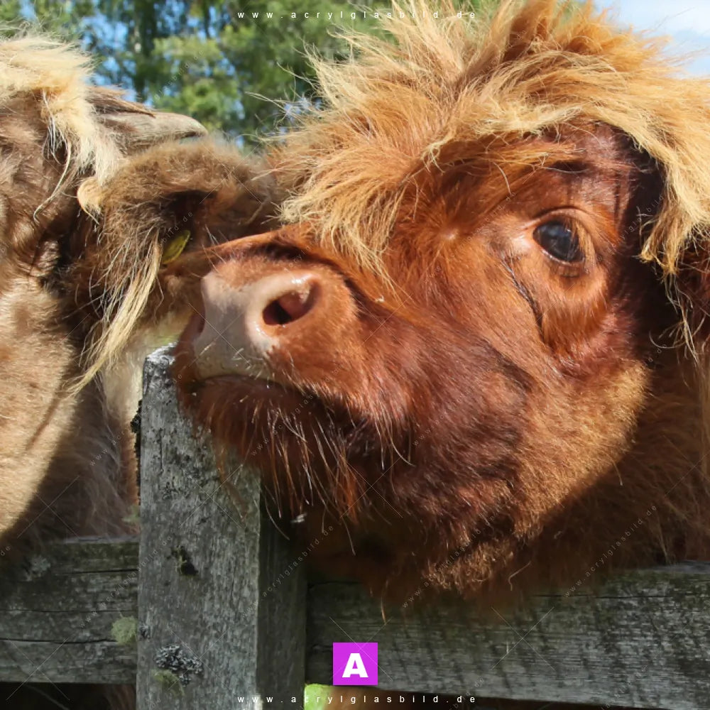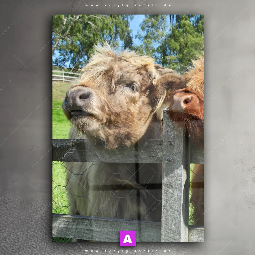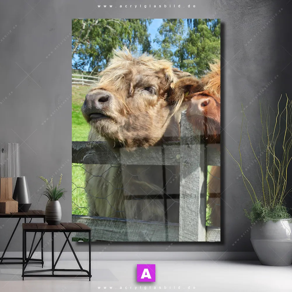 Wenn du auf der Suche nach einem Wandkunstwerk bist, das deine Sinne anregt und deine kreative Seite erweckt, dann ist unser Acrylglasbild Schottland-Rinder aus der Kategorie Tierwelt die perfekte Wahl für dich. Entscheide dich für das Acrylglasbild Rinder schauen über Zaun in den faszinierenden Farben Schwarz, Weiss, da es ideal zu deinem Einrichtungsstil im Modern Art, Natürlich - Realistisch, Schwarz - Weiss-Look passt.