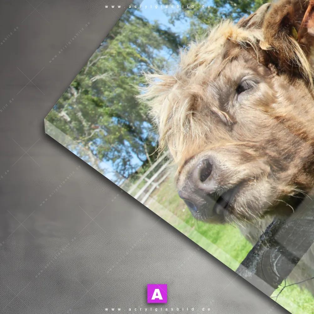 Das Motiv Drei Schottische Rinder wird im UV-Direktdruck in den Farben Schwarz, Weiss auf die Rückseite einer 5mm starken, transparenten Acrylglasplatte gedruckt. Das durchscheinende Motiv Rinder schauen über Zaun im Modern Art, Natürlich - Realistisch, Schwarz - Weiss Stil wird anschließend vollflächig mit einer weißen Schicht hinterlegt. Das Tierwelt Acrylglasbild | Hochformat erhält so eine bemerkenswerte Farbbrillanz, hohe Schärfe und erstaunliche Tiefenwirkung.