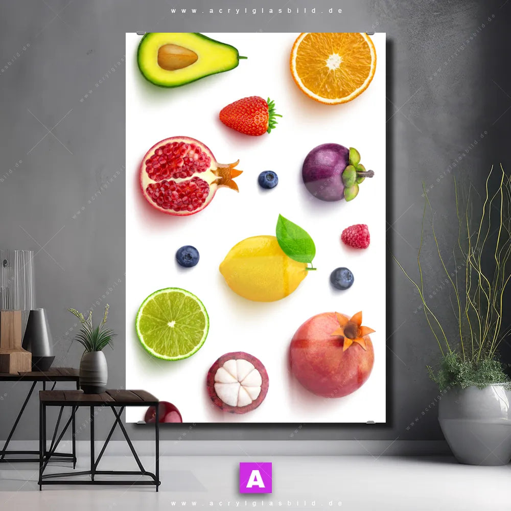 Hallo, auf Wiedersehen langweilige Wände! Gib deinem Raum ein stilvolles Upgrade mit unserem Acrylglasbild Exotische Früchte im Hochformat, das nicht nur Bar - Gastronomie, Küche - Esszimmer, sondern auch jeden anderen Raum im Handumdrehen auf ein neues Niveau hebt!